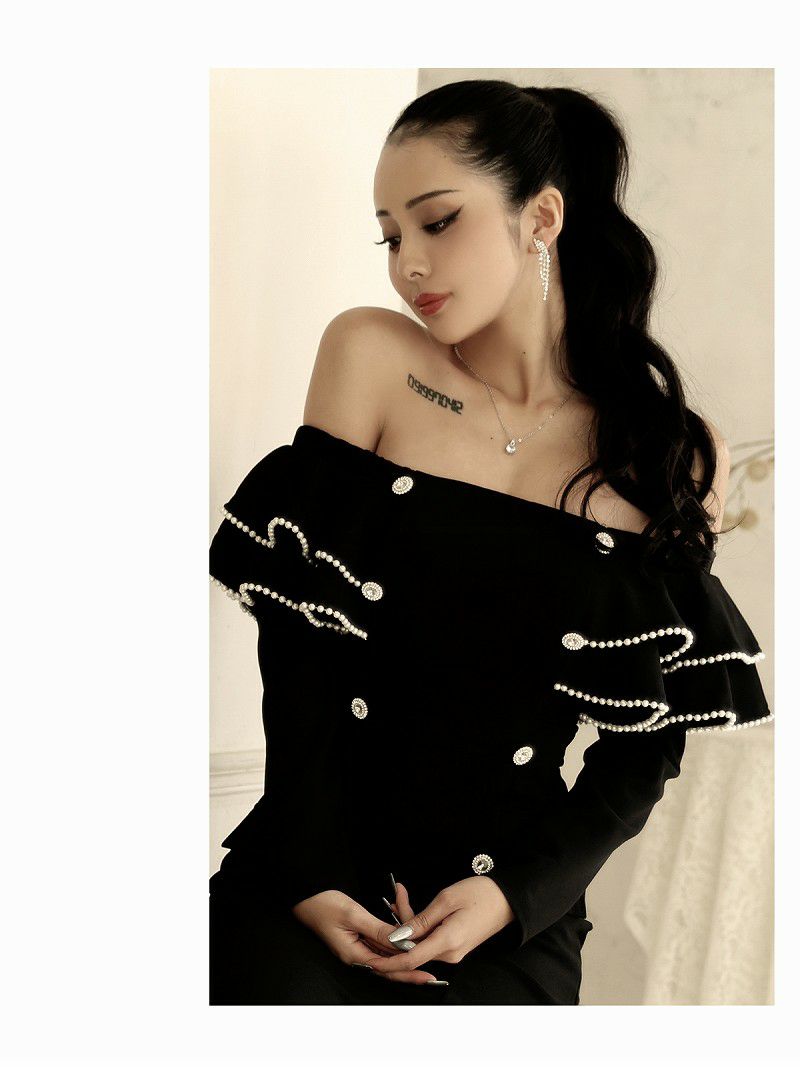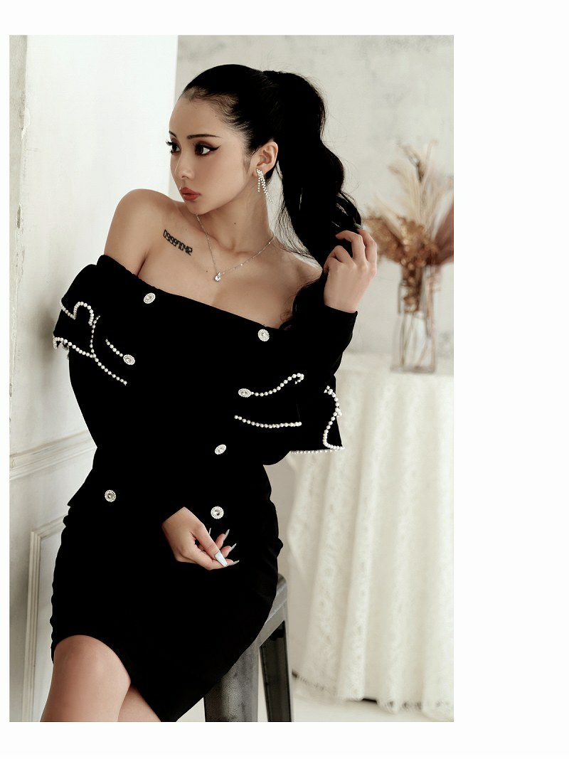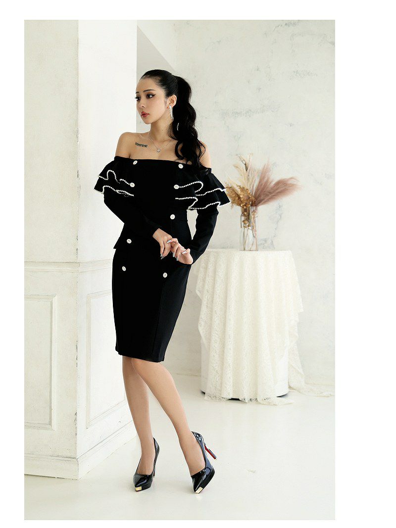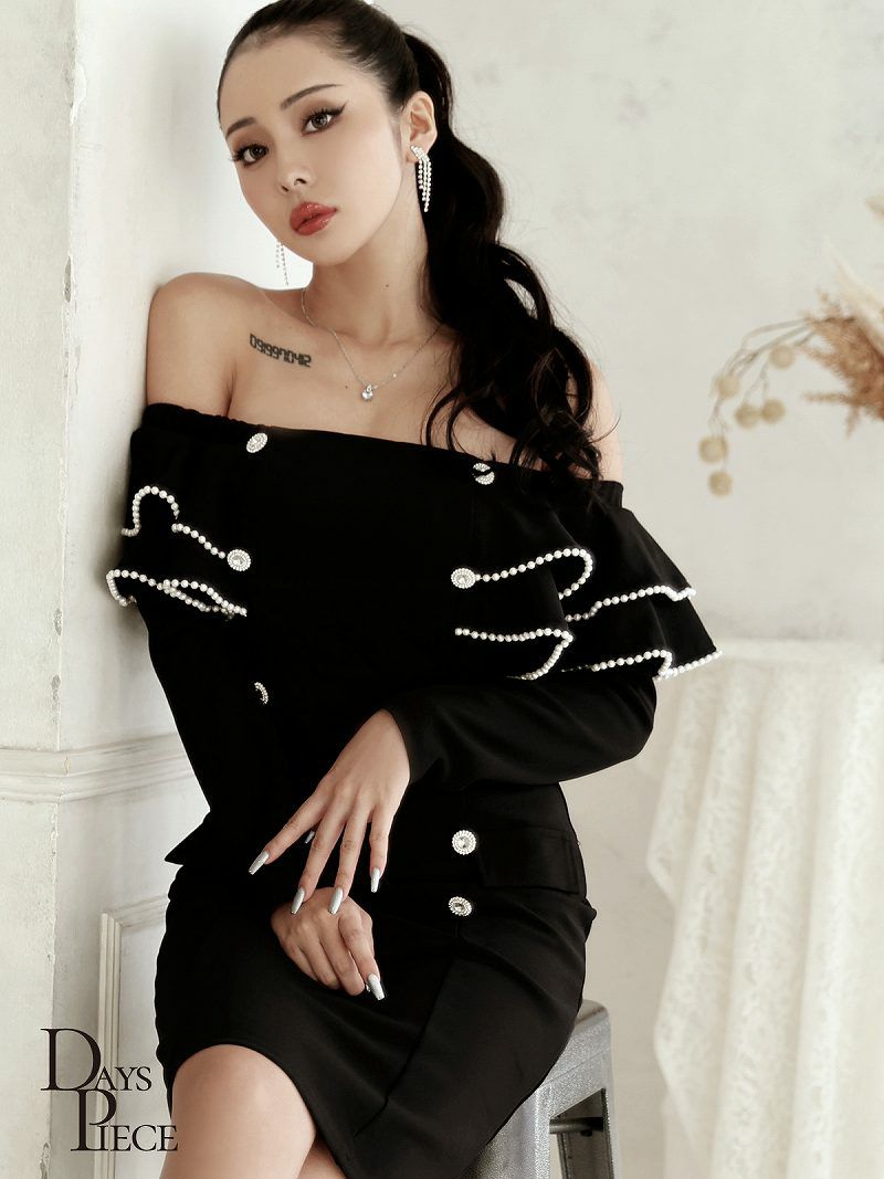 膝丈オフショルダー袖付きフリル韓国ワンピース KANO 着用 キャバワンピース【DaysPiece】