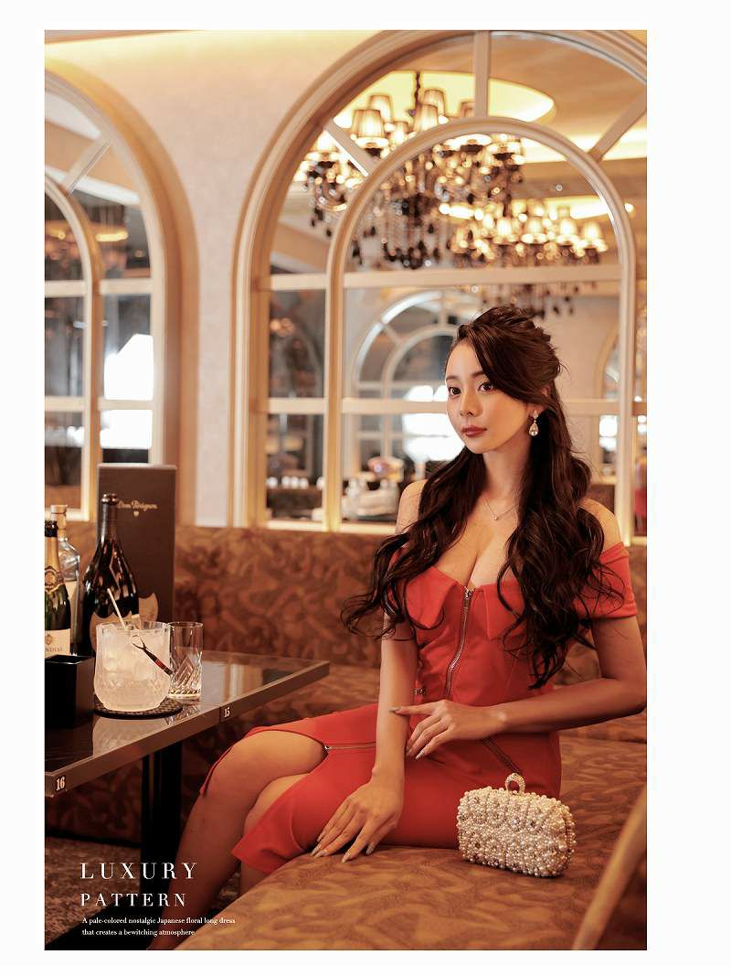 オフショルドレスは適度な露出が色気UP!更にフロントのジップデザインは自分の好みの位置で下げることができるから程よい位置で谷間をアピールし、お客様をドキドキさせるキャバ嬢ワンピースです。