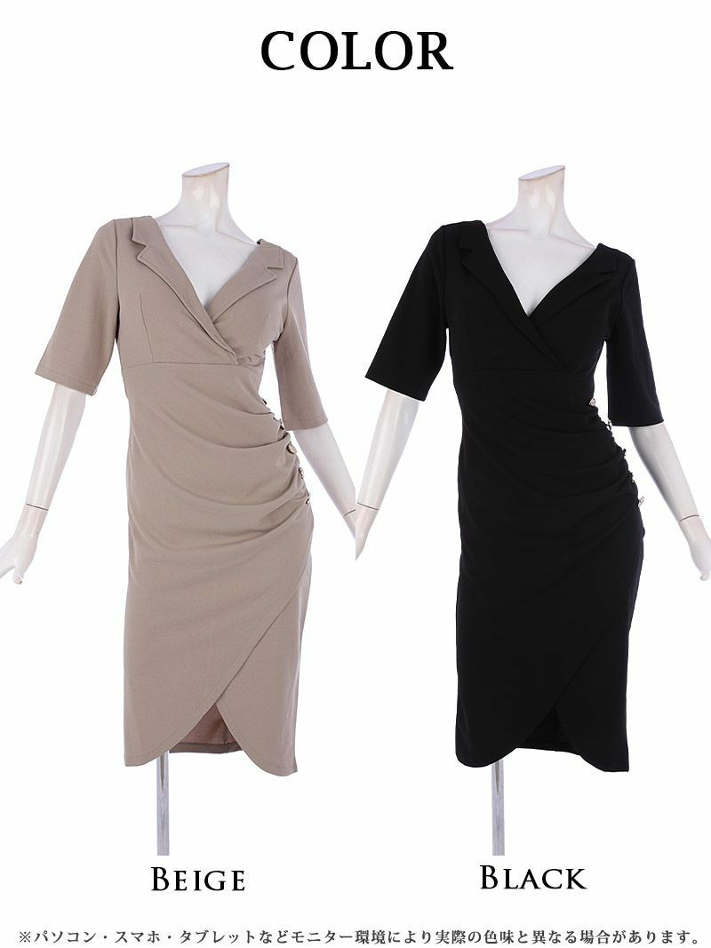 5. サイドギャザーセレブ韓国カシュクールタイトワンピース【DAYS PIECE】膝丈ワンピース(S/M/L/XL(2L))(ブラック/ベージュ) ptpl