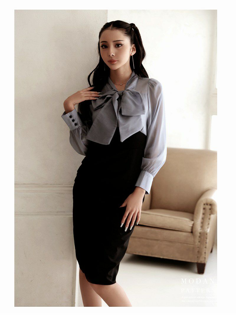 バイカラービッグリボン長袖ブラウジングキャバワンピース KANO 着用 韓国ドレス【DAYS PIECE】