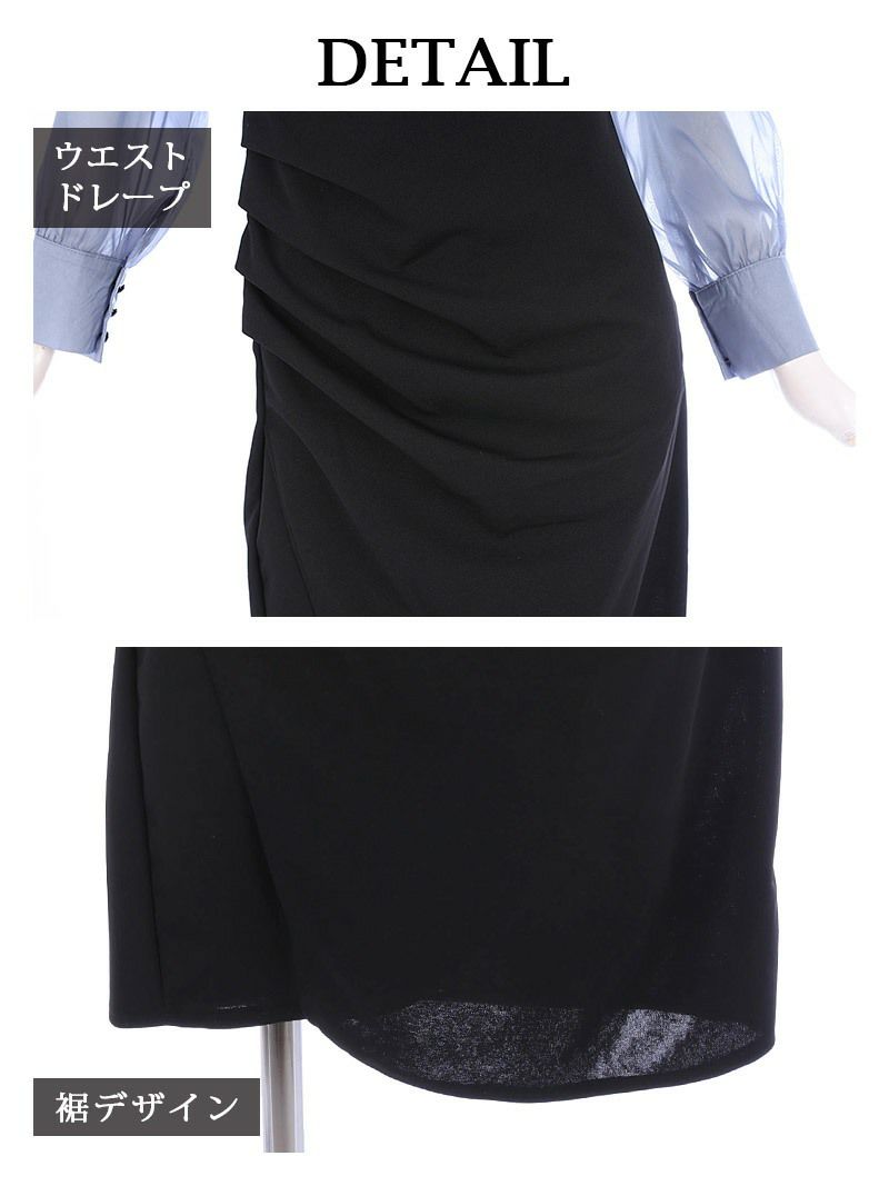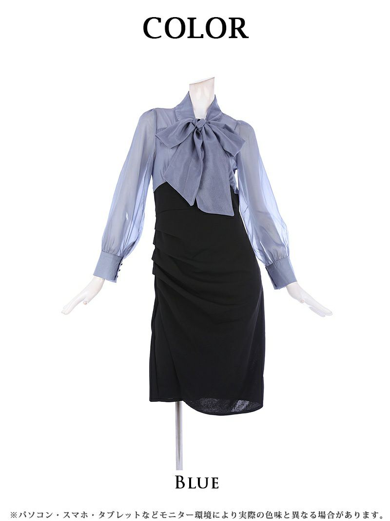 7. バイカラービッグリボン長袖ブラウジングキャバワンピース KANO 着用 韓国ドレス【DAYS PIECE】(M/L/XL)(ブルー) ptpl