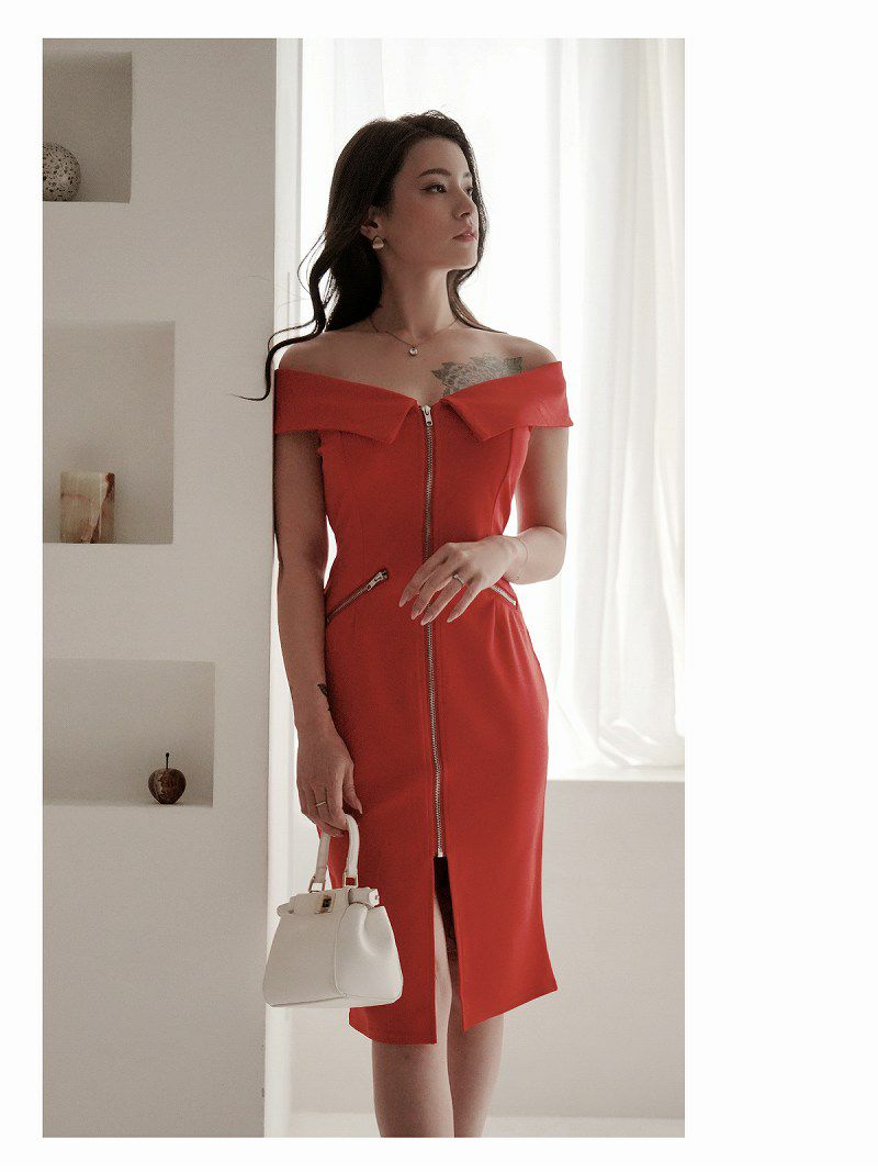 膝丈のワンピースで上品に、大人の魅力を際立たせるデザイン。ジップ仕様で着脱も簡単。