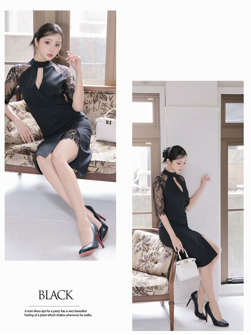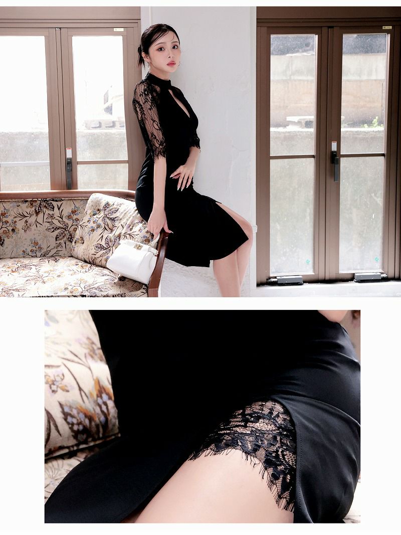 レース×スリットが華やかに映える韓国ドレス風の1着はキャバワンピースやラウンジワンピースとしても着用OK。