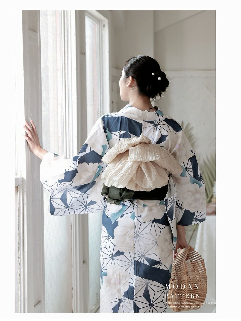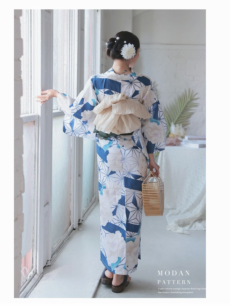 5. 浴衣 レトロモダンなブルーリーフに咲く牡丹レディースセパレート浴衣 KANO 着用 二部式浴衣【Ryuyu】(フリーサイズ)(ホワイト)