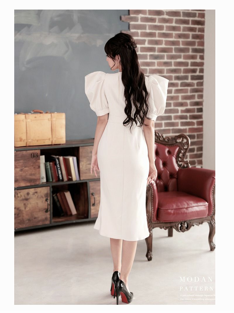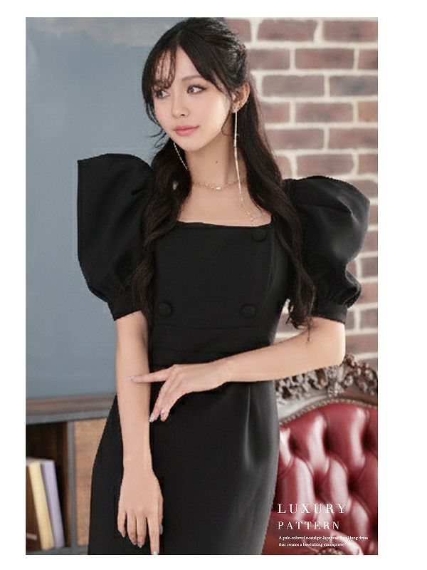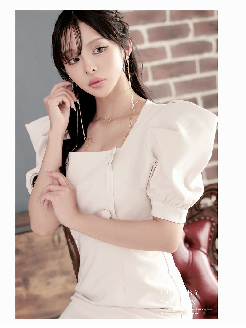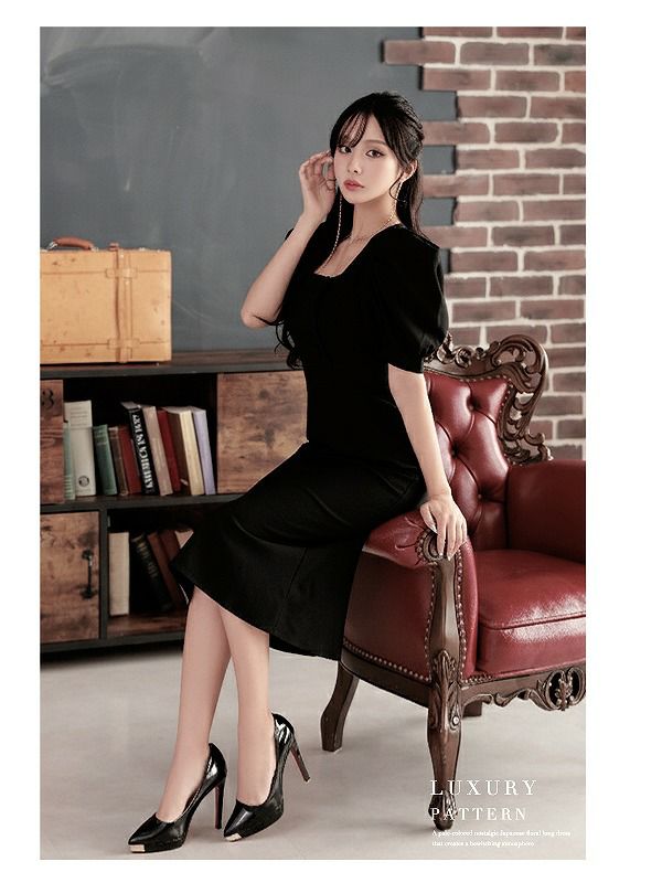 スクエアネックギャザータイトミディ丈袖付き韓国ドレス KANO 着用 キャバワンピース【DAYS PIECE】