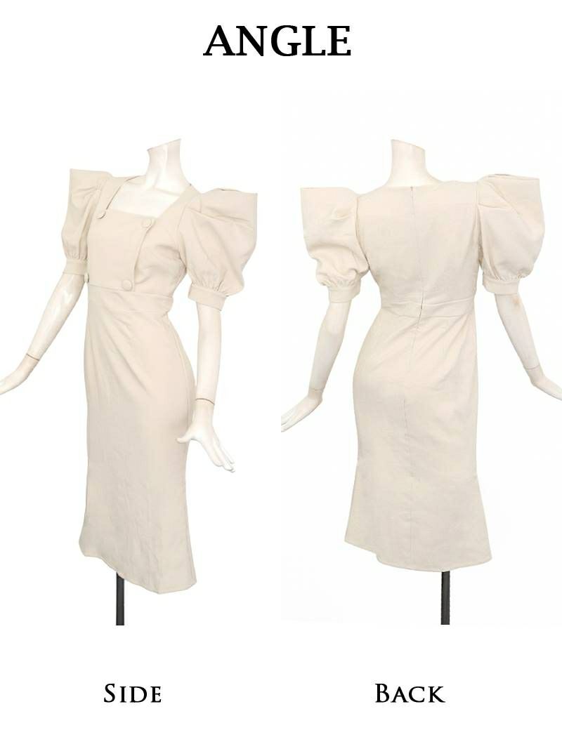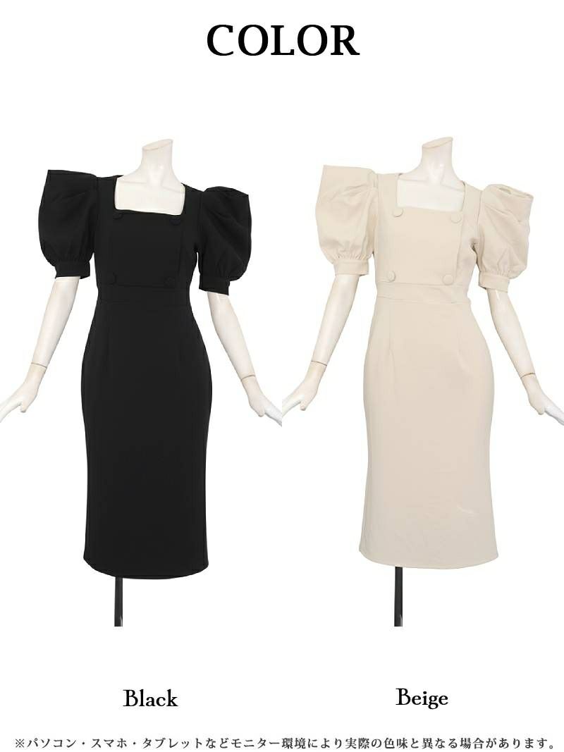 4. スクエアネックギャザータイトミディ丈袖付き韓国ドレス KANO 着用 キャバワンピース【DAYS PIECE】(S/M/L/XL(2L))(ベージュ/ブラック)