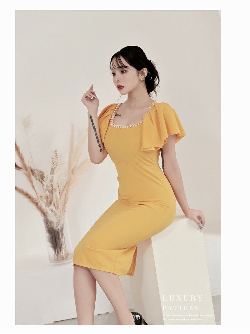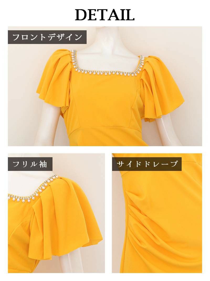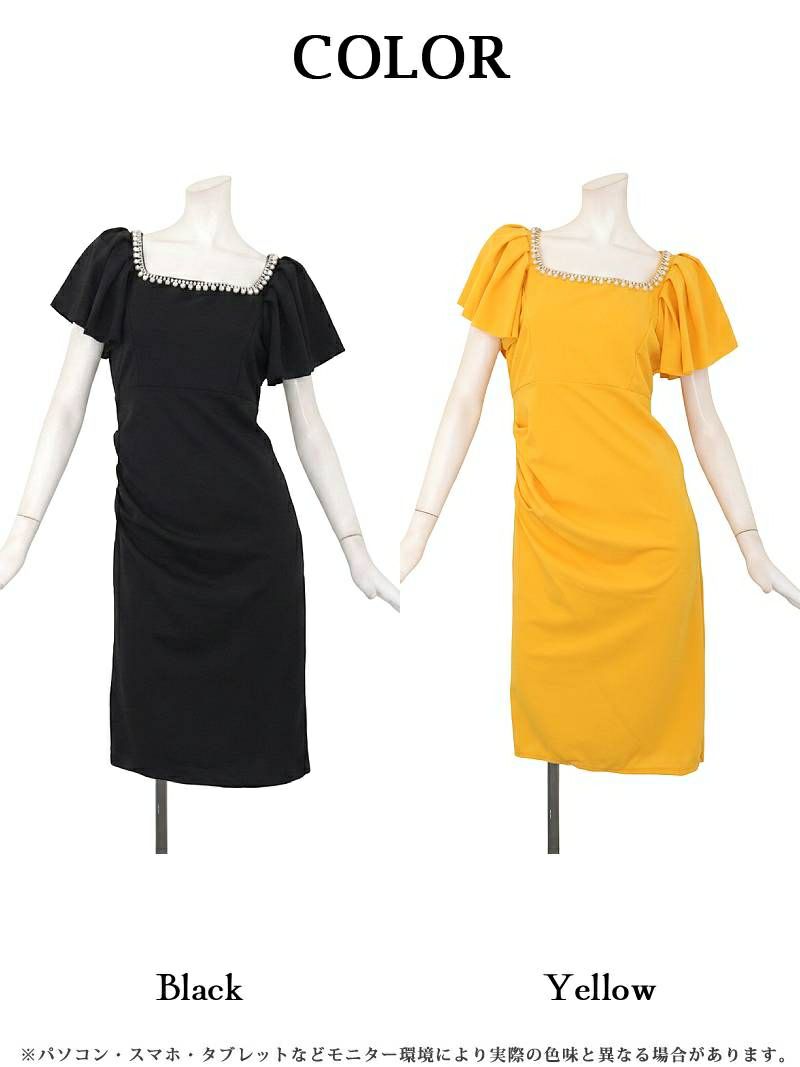 5. パールビジュー付き二重フリル袖ハイウエスト切り替えタイトキャバドレス 韓国style足長ミニワンピ KANO 着用 キャバワンピース【DaysPiece】(S/M/L/XL(2L))(ブラック/イエロー)
