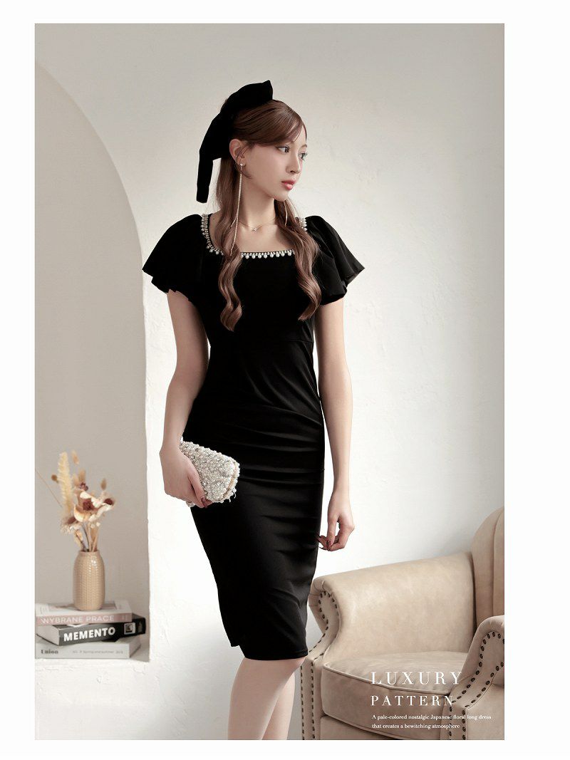 パールビジュー付き二重フリル袖ハイウエスト切り替えタイトキャバドレス 韓国style足長ミニワンピ KANO 着用 キャバワンピース【DaysPiece】