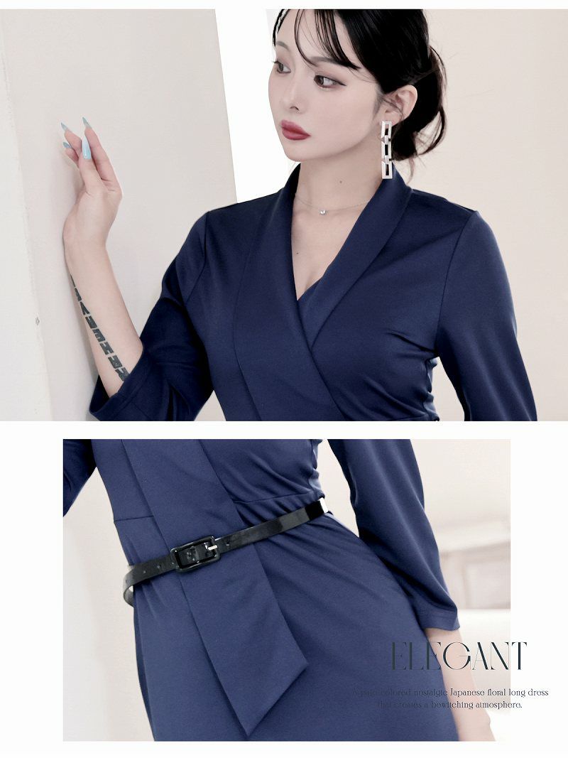 上品なネイビーと韓国風シルエットで、洗練された大人な魅力を放つベルト付きカシュクールワンピース。 カシュクール七分袖ストレッチ韓国風キャバワンピース ベルト付き KANO 着用 キャバワンピース【DaysPiece】(S/M/L/XL(2L)/XXL(3L))(ブラック/ネイビー/ワイン)