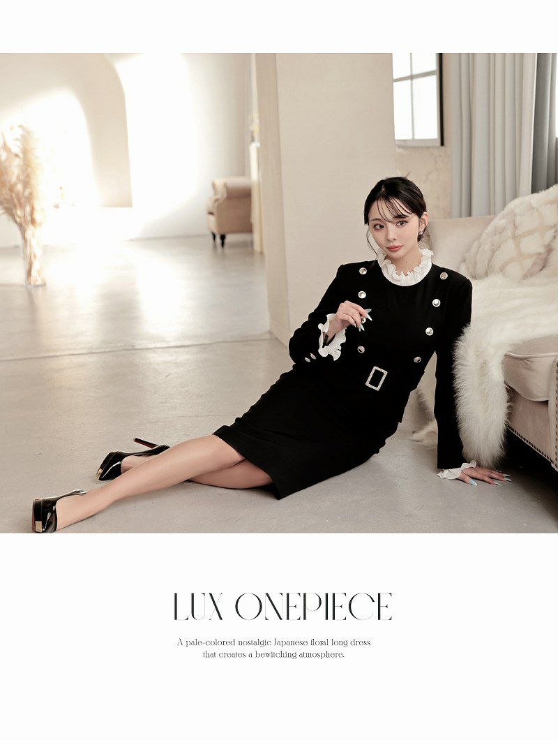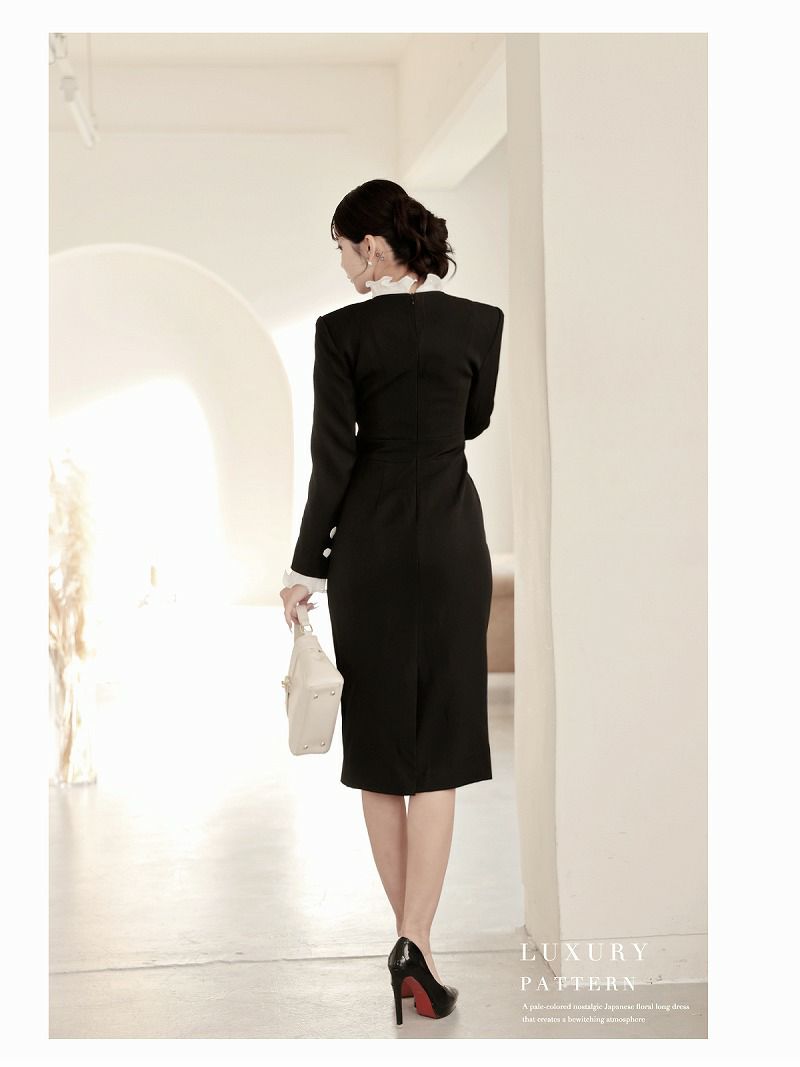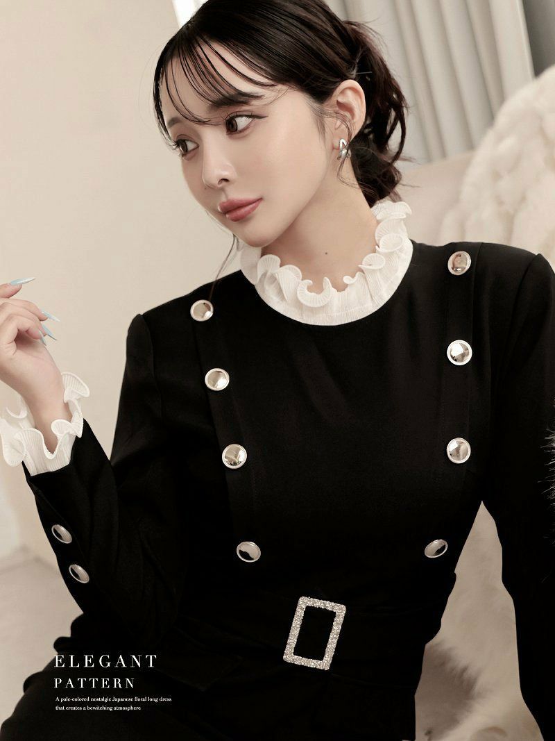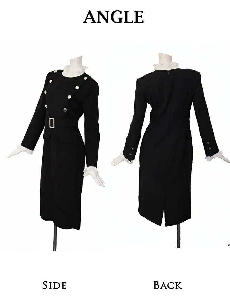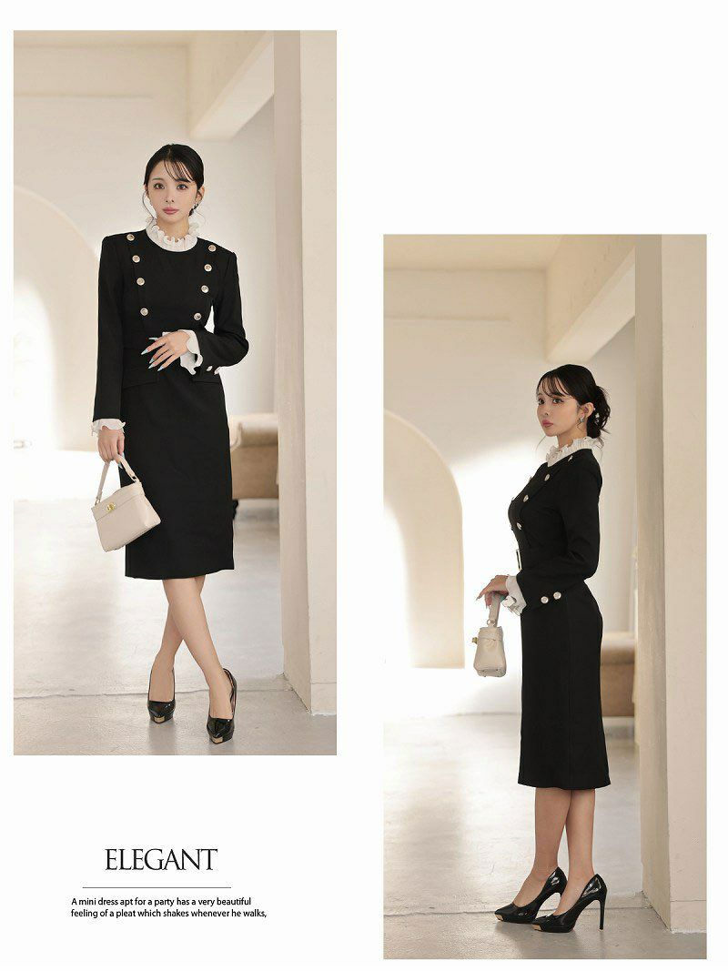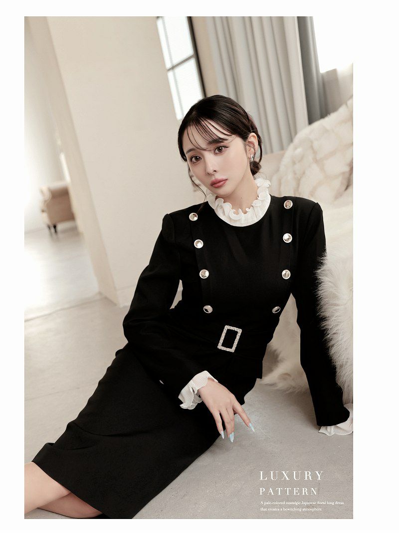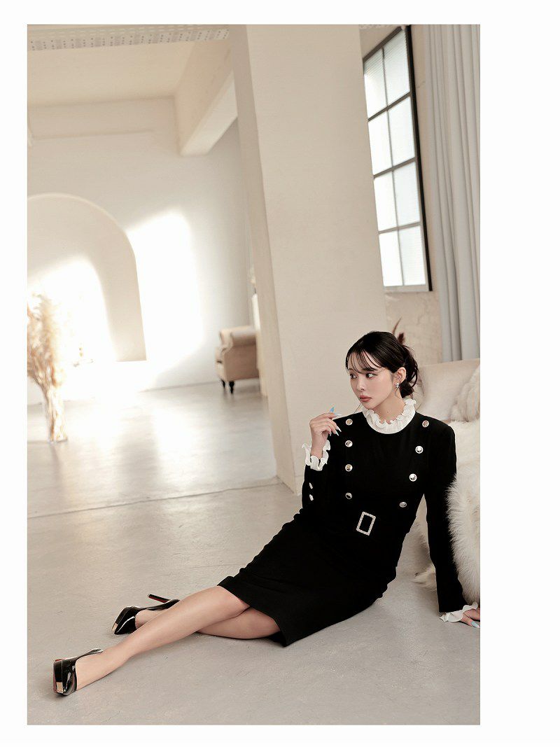アコーディオンプリーツのフリルとダブルボタンで、気品あふれる韓国styleな貴女に。 先行予約割¥10800→¥10260!※一部予約販売※アコーディオンプリーツのフリルが上品なレイヤード風ダブルボタン韓国風タイトドレス KANO 着用 キャバワンピース【DaysPiece】(S/M)(ブラック)