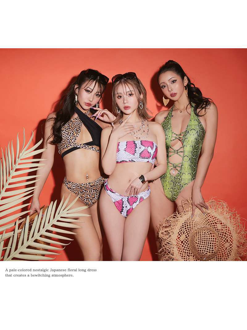 派手バンドゥビキニでインスタ映え◎ 水着 パイソン柄ピンクバンドゥ水着 アニマルデザインレディース水着【Ryuyu】(M/L)(ピンク)