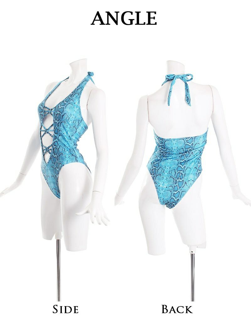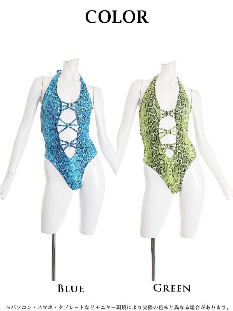 編み上げモノキニでセクシーに♪ パイソン柄ネオンカラーモノキニワンピース水着 KANO 着用 水着【Ryuyu】(S/M)(ブルー/グリーン)