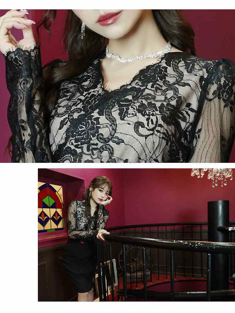 5. 先行予約割¥7390→¥7021!※一部予約販売※ヌーディーレース長袖キャバドレス れいぽよ 着用 ミニドレス【Ryuyu】(S/M/L/XL(2L))(ブラック)