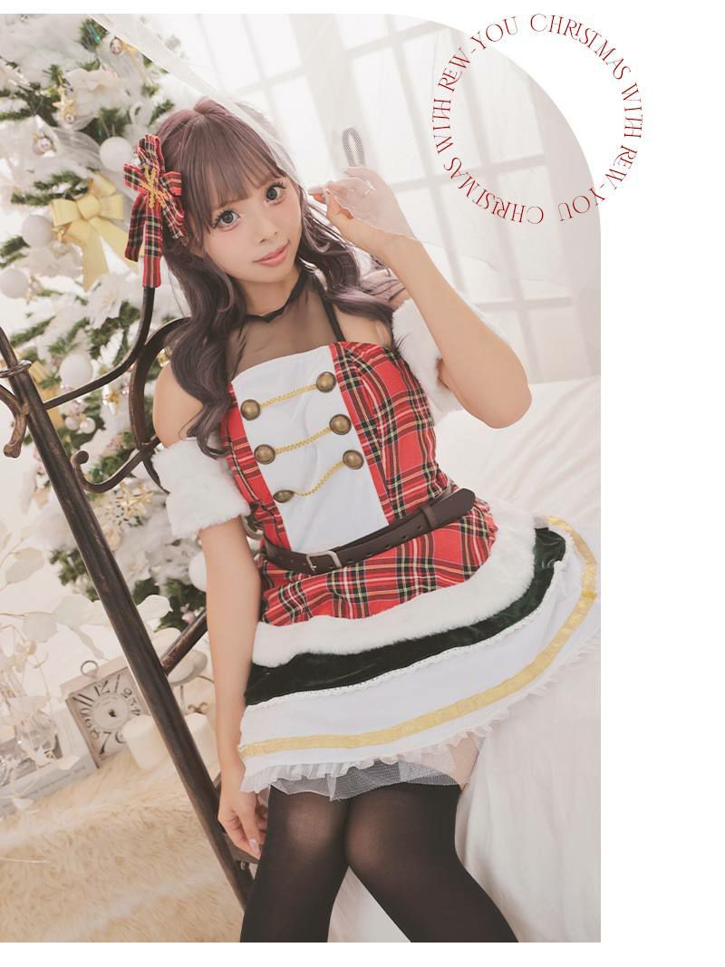 サンタコスプレ オープンショルダー赤色チェック柄Aラインサンタコスプレ6点セット あいさ 着用 キャバサンタ【Ryuyu】