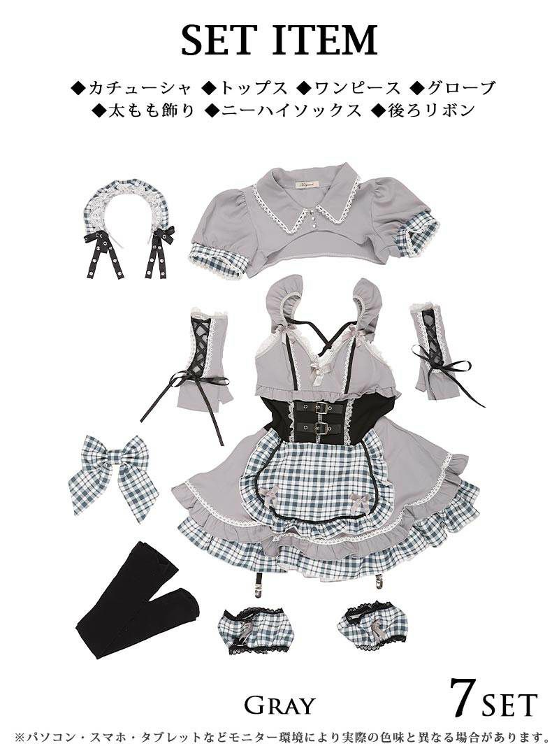 甘くてちょっぴり毒かわいいメイドコス♪ コスプレ ギンガムチェック半袖ロリータメイド服コスプレ あいさ あいみん 着用 レディースコスプレ7点セット【Ryuyu】(フリーサイズ)(グレー/ブラック/パープル)