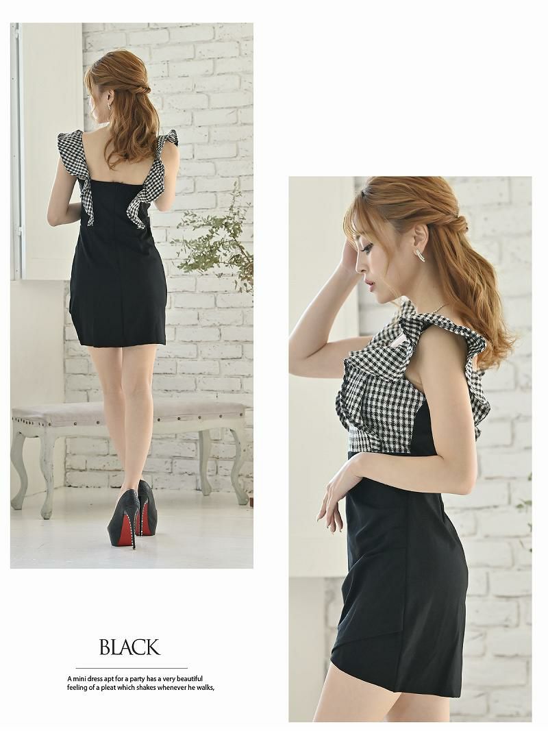 6. 【訳ありアウトレット】可愛いチェック柄のフリル袖キャバミニドレス【Ryuyu】(S/M)(ブラック/ブルー/ピンク)