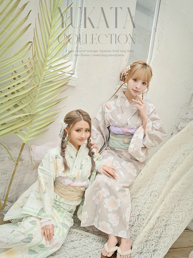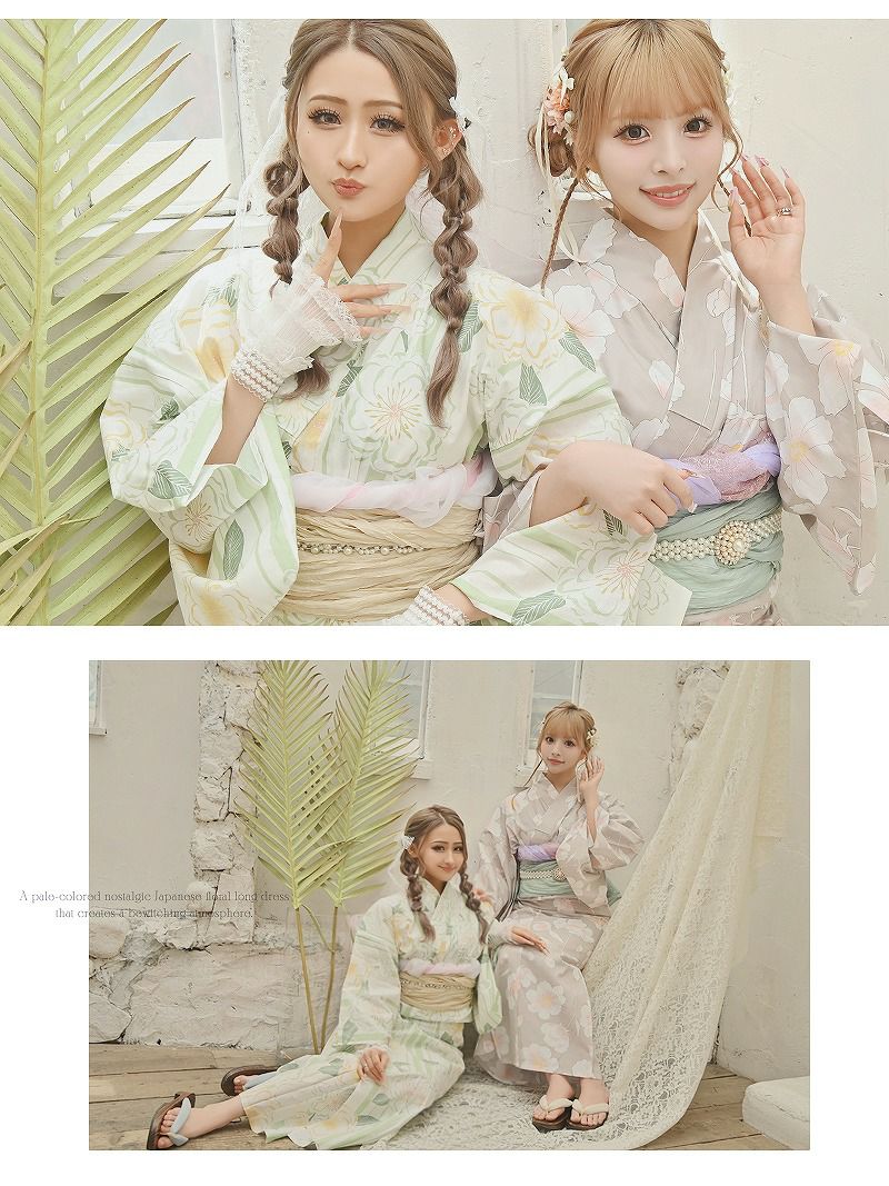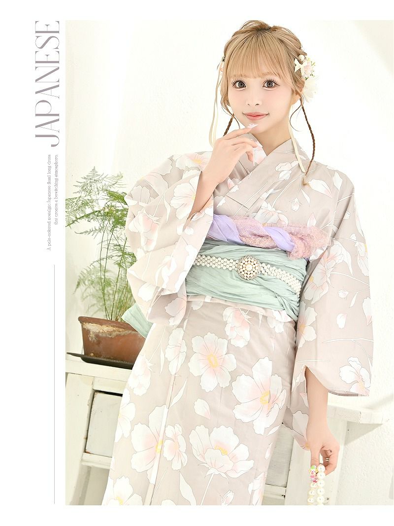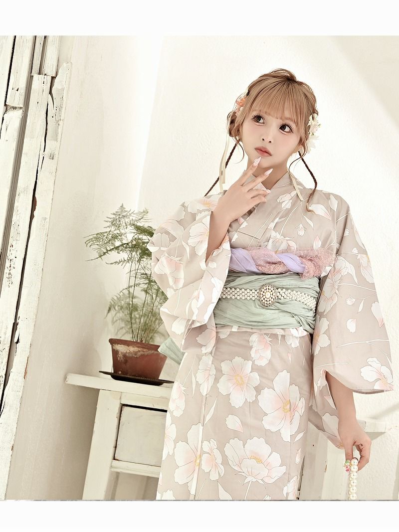 ※予約販売※くすみベージュがかわいい椿柄レディース浴衣 あいさ 着用 ギャル浴衣2点セット【Ryuyu】