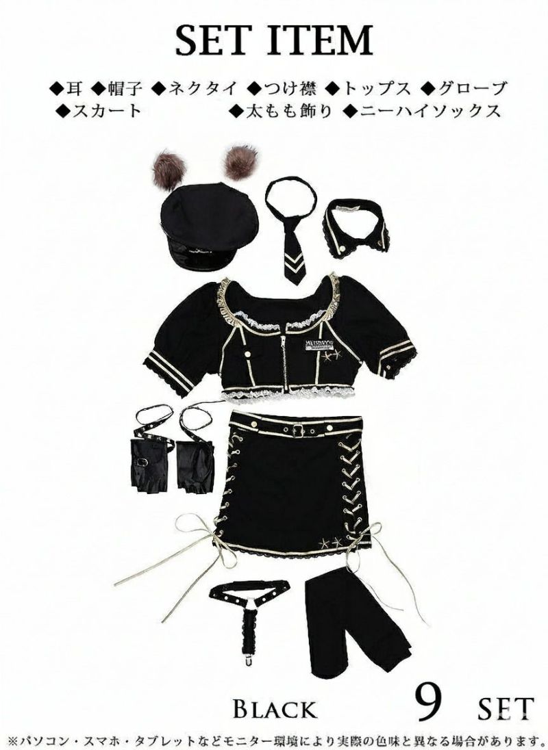 セット内容:帽子・耳・つけ襟・ネクタイ・トップス・スカート・グローブ・太もも飾り・ニーハイソックス