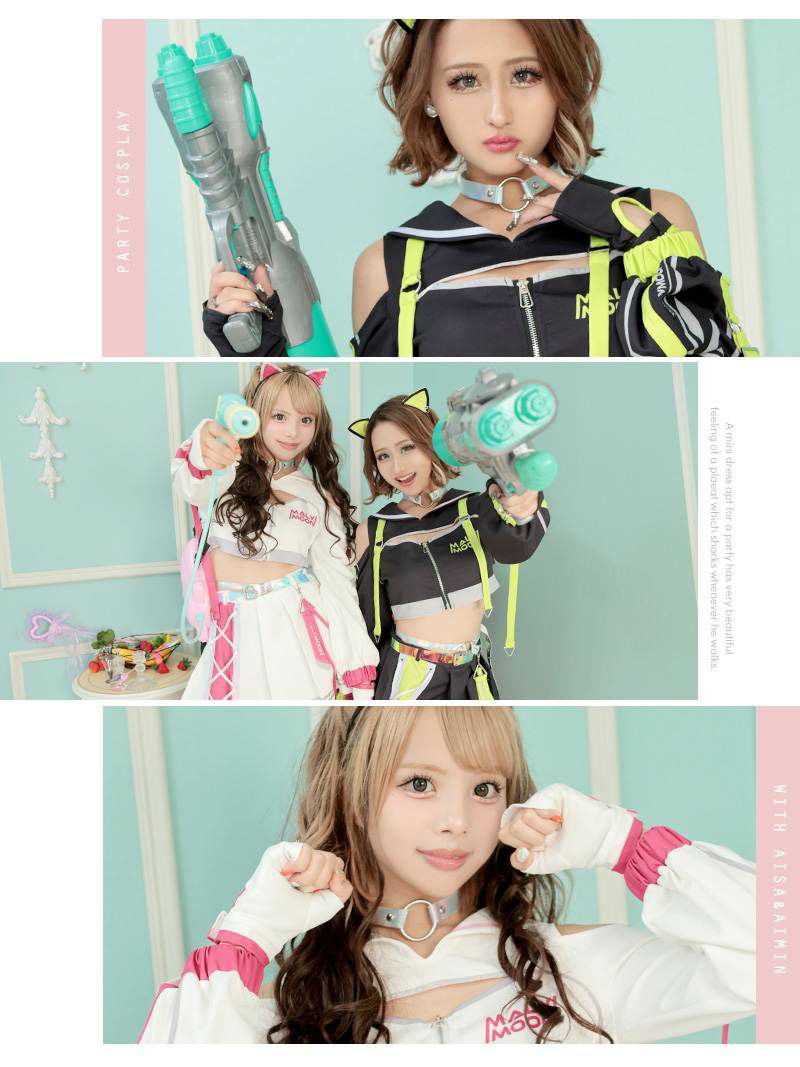 ハイブリッドなハロウィンコスプレで映えを狙う! コスプレ サイバーデザインキャット袖付きハロウィンコスプレ あいさ あいみん 着用 レディースコスプレ9点セット【Ryuyu/リューユ】(フリーサイズ)(ブラック×ネオンイエロー/ホワイト×ネオンピンク)