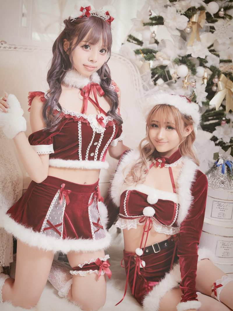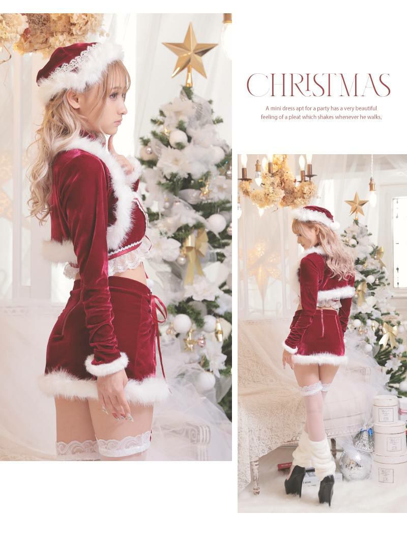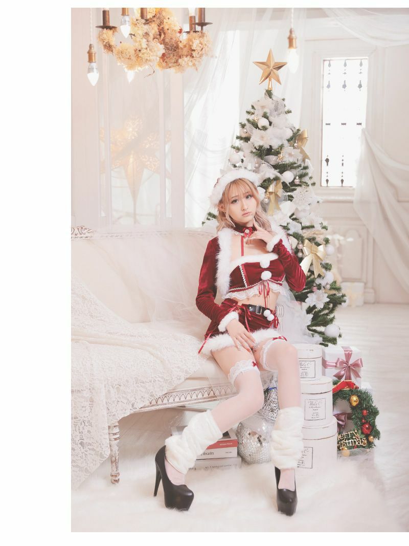 ちょいエロデザインが男ウケ◎ サンタコスプレ セクシーレースアップ肌見せセットアップサンタコスチューム6点セット あいみん 着用サンタコスプレ【Ryuyu】(フリーサイズ)(レッド)