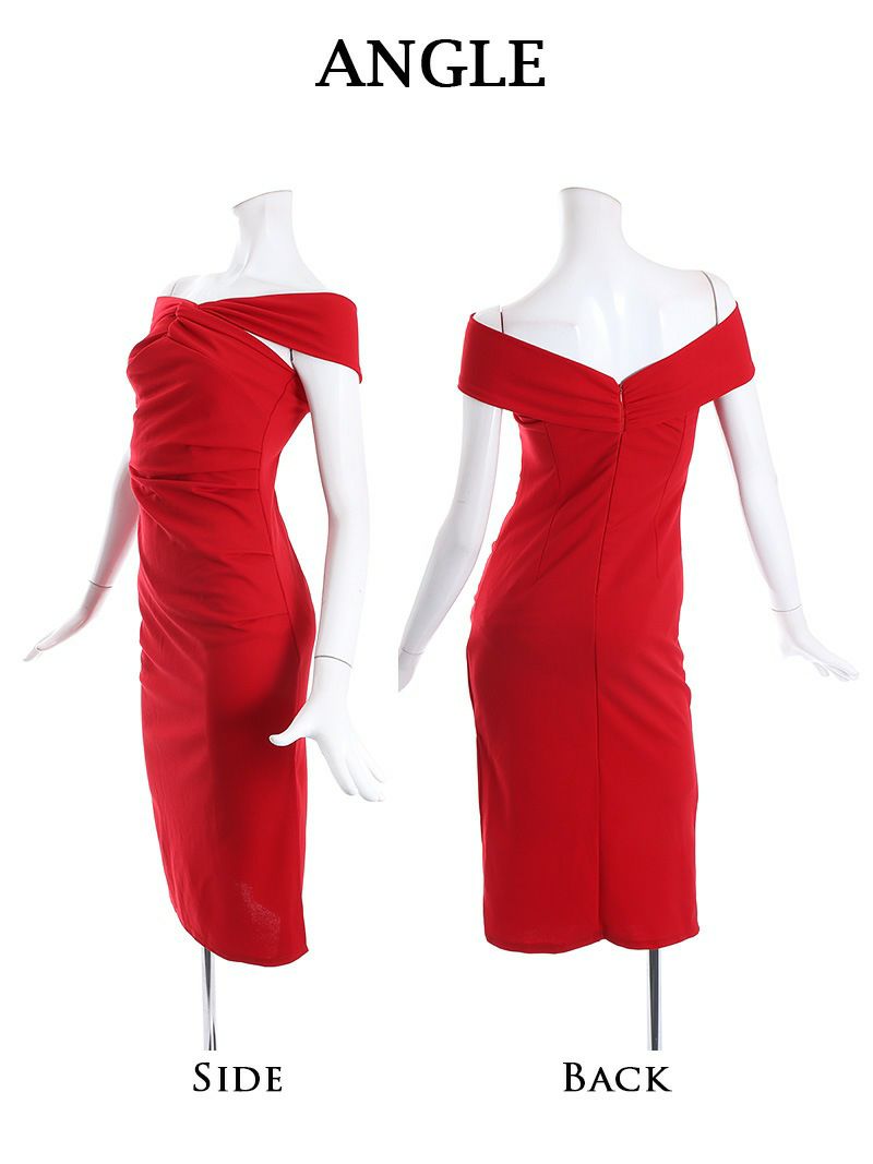 女性らしいシルエットで魅了する スーパーSALE¥4380→¥4332! 膝丈デザイン大人シルエオフショルダーキャバドレス りおん 着用 ミニドレス【RyuyuChick】(S/M/L)(ブラック/レッド)