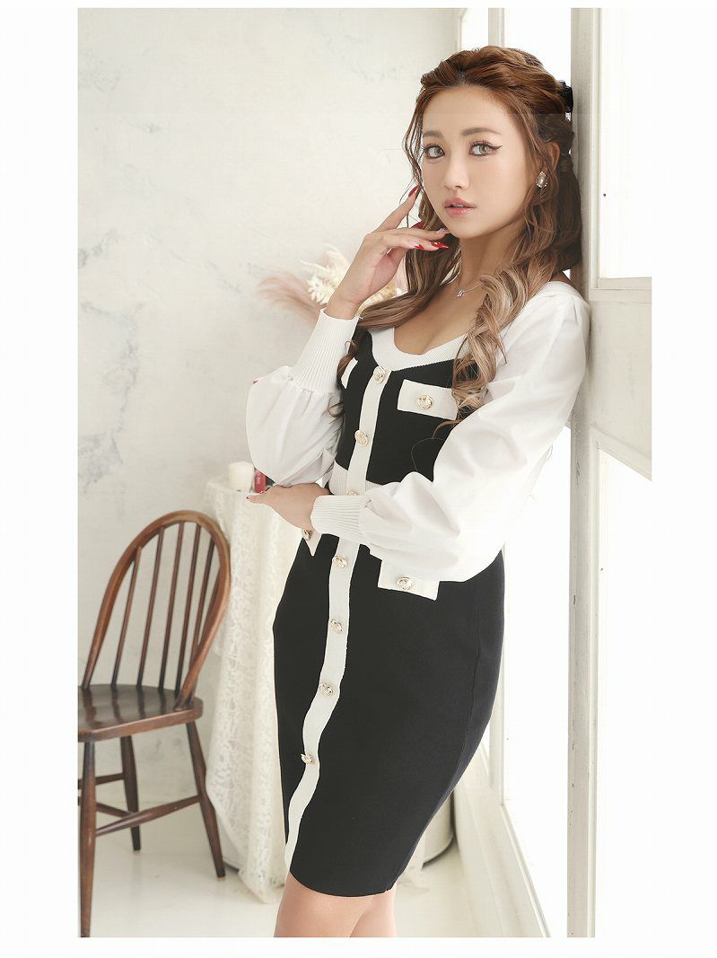 バイカラー袖付きニット韓国風キャバドレス りおん 着用 ミニドレス【RyuyuChick】