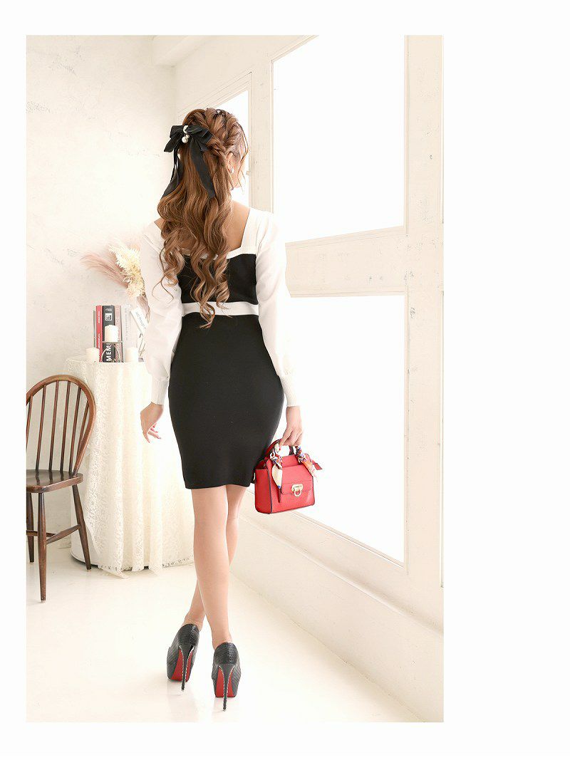 6. 先行予約割¥4090→¥3886!※一部予約販売※バイカラー袖付きニット韓国風キャバドレス りおん 着用 ミニドレス【RyuyuChick】(M)(ホワイト/ブラック)
