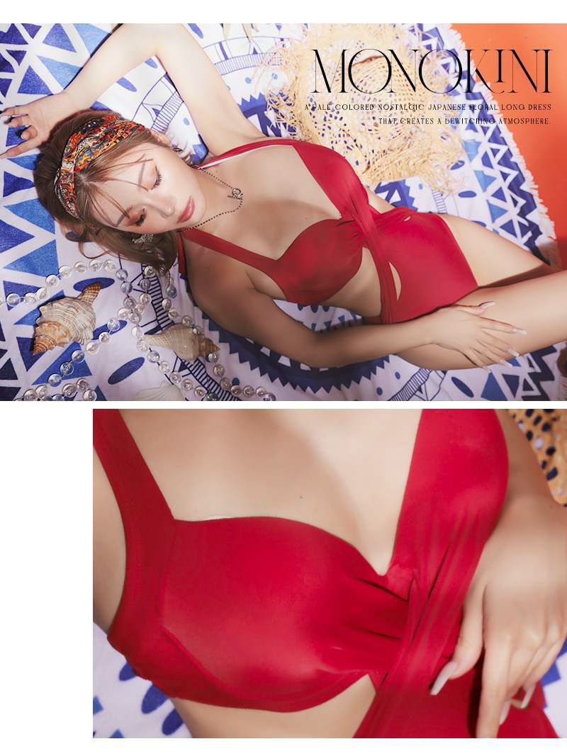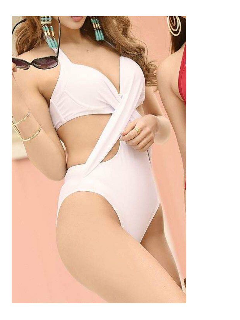 魅力的なカットアウトモノキニ 水着ワンカラーウエストカットアウトモノキニホルターネックワンピース【Ryuyu】(S/M)(ホワイト/レッド)