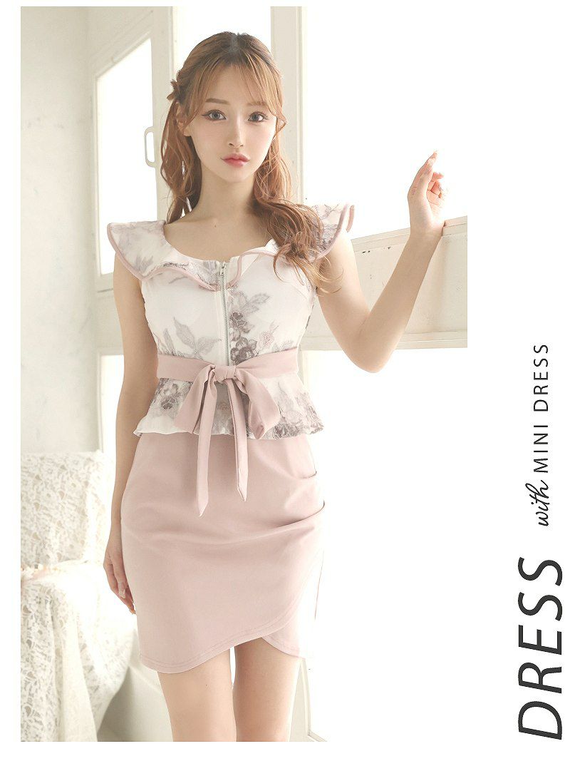 ウエストリボン付きの花柄ペプラムキャバミニドレス、訳ありアウトレットで特別価格!大人の魅力を引き立てるミニ丈です。