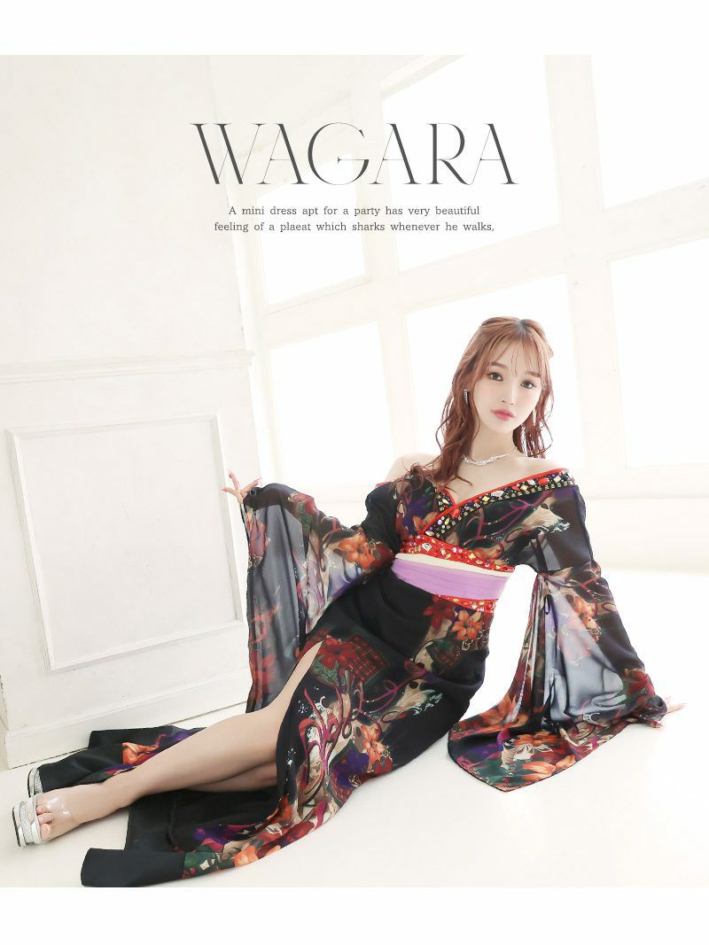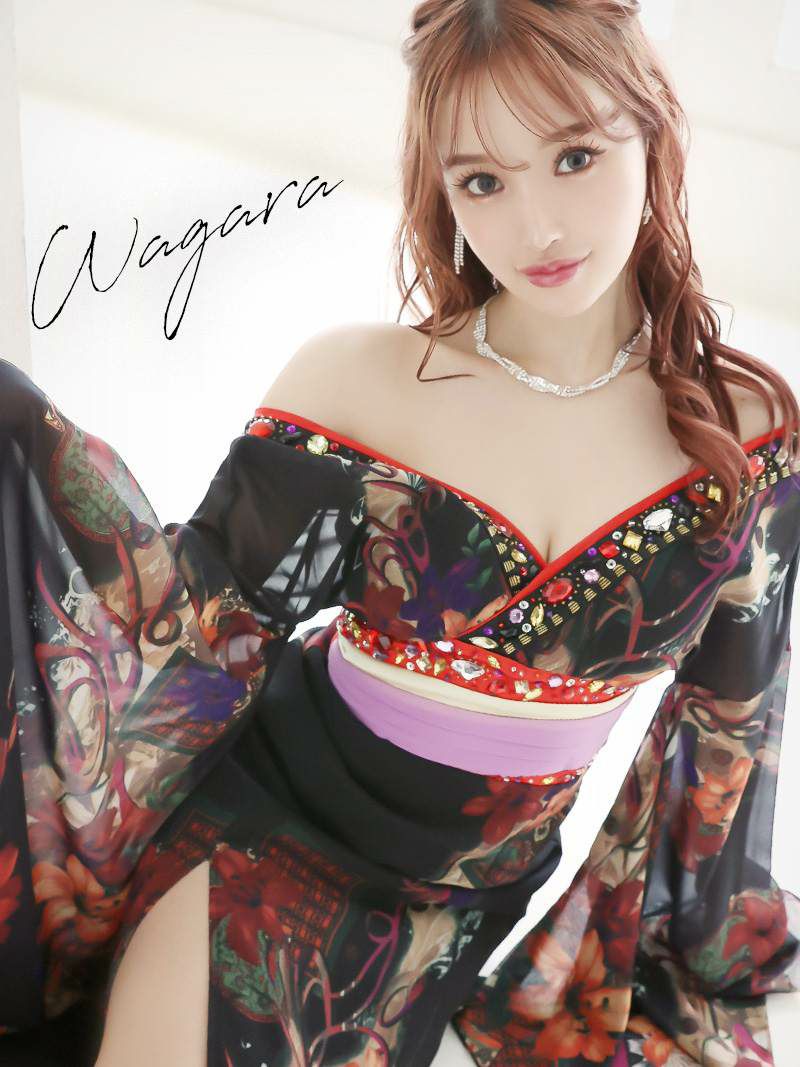 シフォン生地で動くたびにふんわり揺れるシルエットが上品で、しっかり谷間魅せもできるのでsexyさもプラスされた花魁ドレスです。