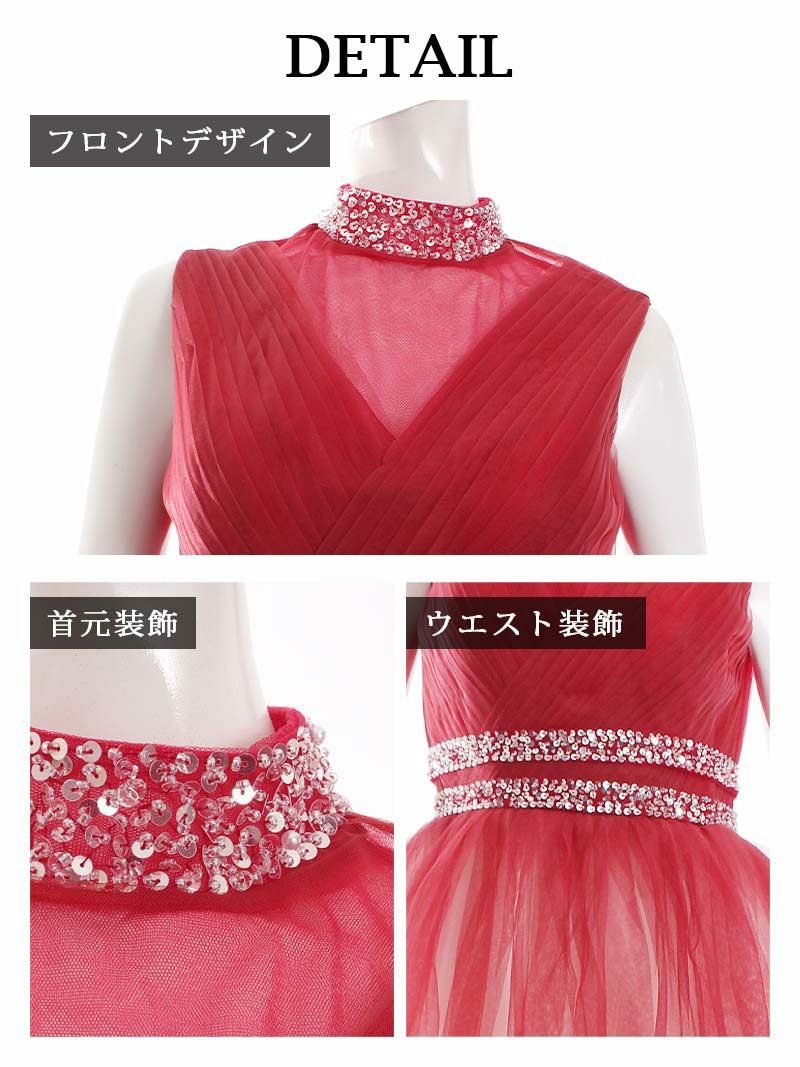 ハイネックとウエストにたっぷりと施されたパールビーズとスパンコールの煌めきが華やかなのでSNS映えも抜群なロングドレス。