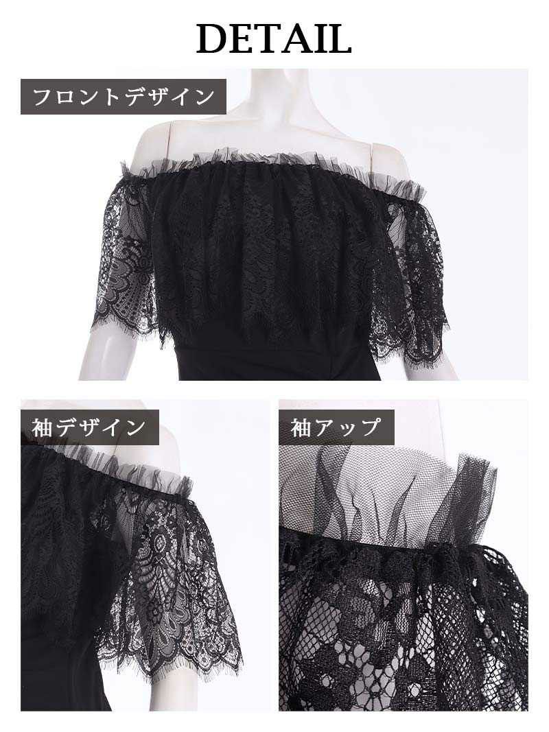 フォーマル高貴エレガント! スーパーSALE¥6980→¥5333! ボリュームレースオフショル膝丈ミニドレス キャバドレス【Ryuyu】(M/L)(ブラック/ホワイト)