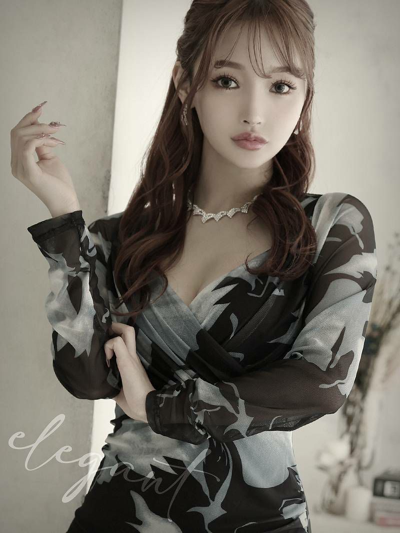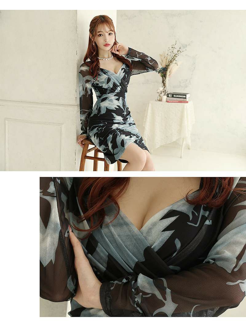 カシュクールデザインとメッシュの長袖がエレガントさを演出し、袖付きで気になる部分も体型カバーが可能です。