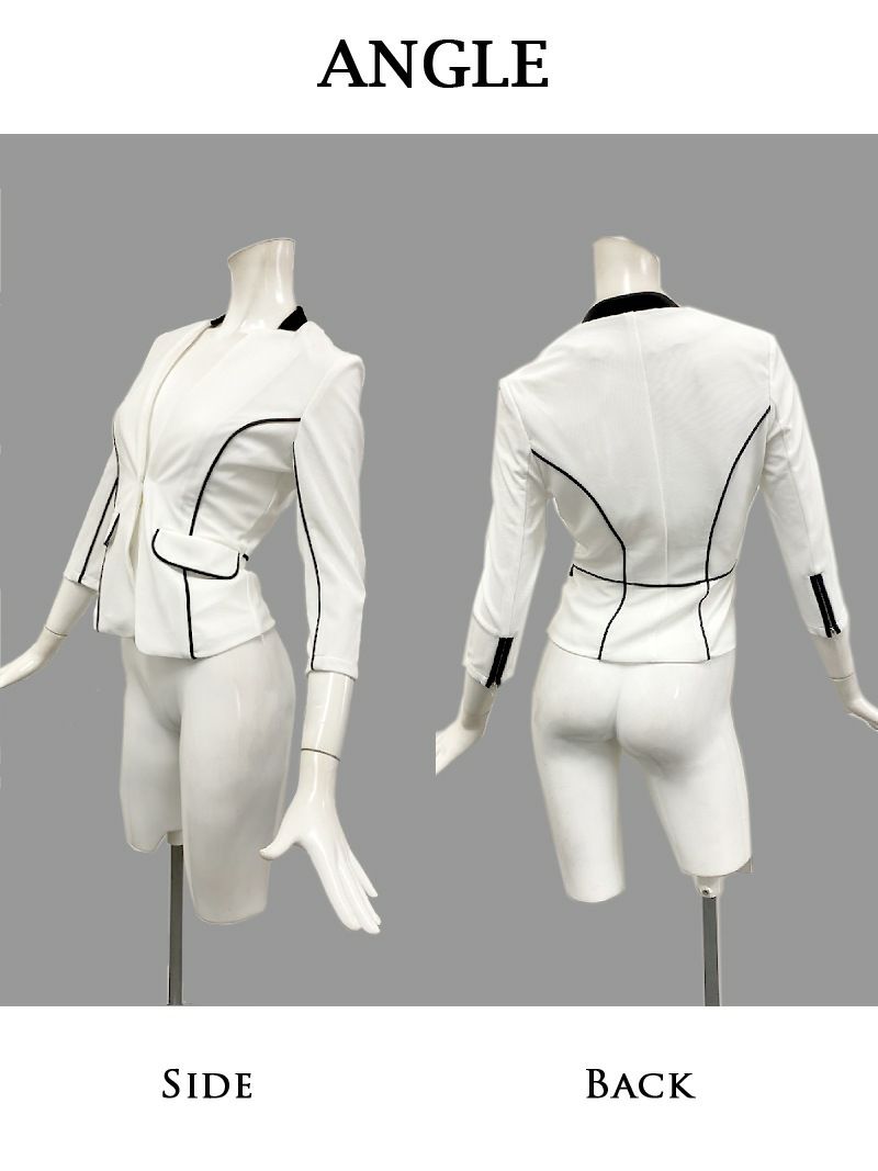 クールな白地に映える黒のパイピングが目を引く、洗練されたデザインのノーカラージャケットが登場!
