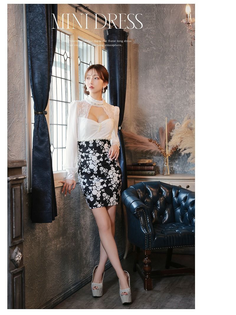 6. 長袖花柄レースタイトミニドレス【Ryuyu】(S/M/L/XL(2L))(ブラック/ホワイト) ptpl