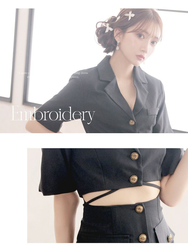 お腹の下に見える2本のラインでデザイン性あるセットアップはトレンドキャバクラスーツとしてバッチリ。