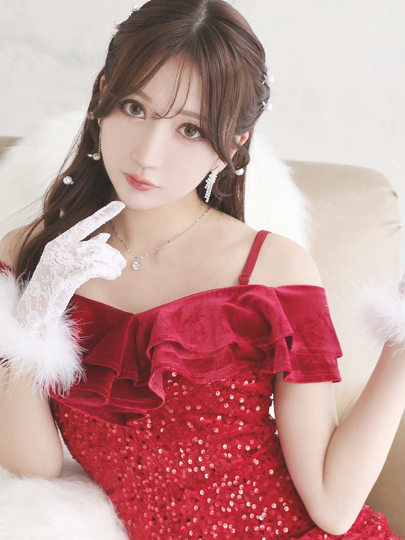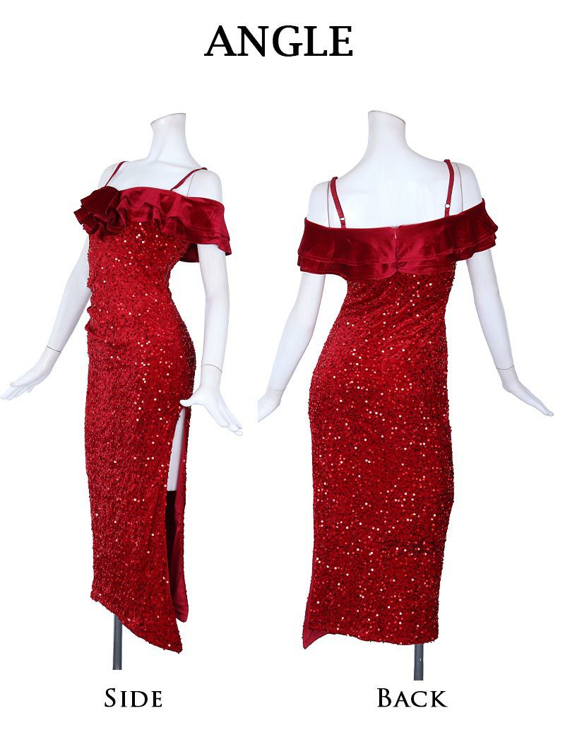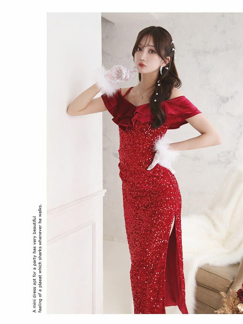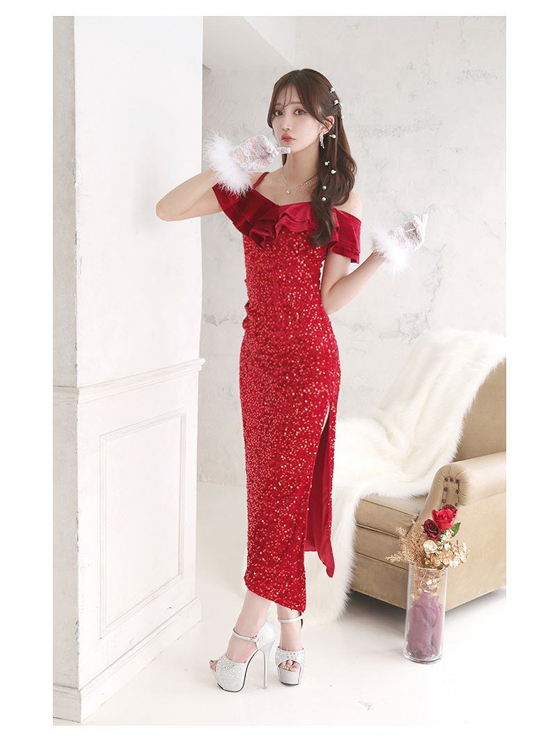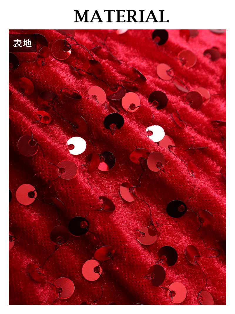 目を惹く華やかな赤のスパンコールが映えるクリスマスドレスです。