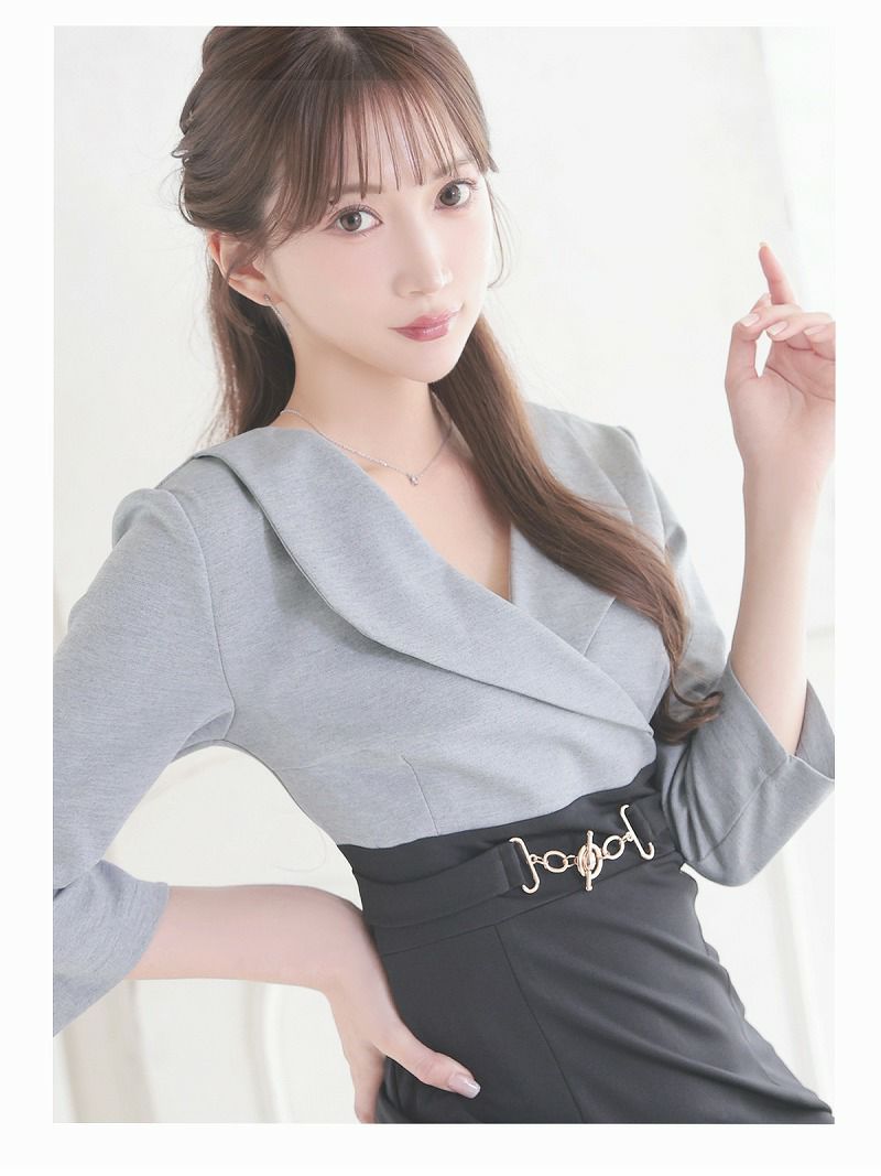 バイカラー×グレーの落ち着いた色合いに、襟付き&七分袖でしっかりきちんと感を演出できるキャバドレスです。