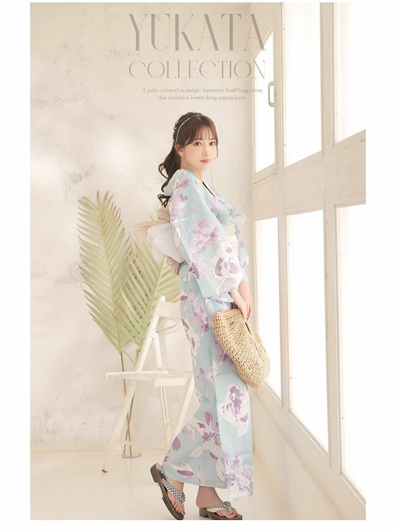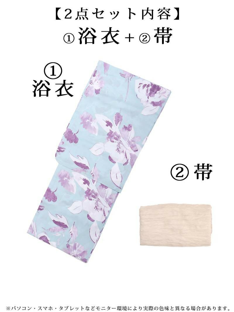 大人可愛いが叶う、甘め×華やか浴衣 マリンブルーにパープルフラワーが華やかなレディース浴衣2点セット【Ryuyu】(フリーサイズ)(ミント)