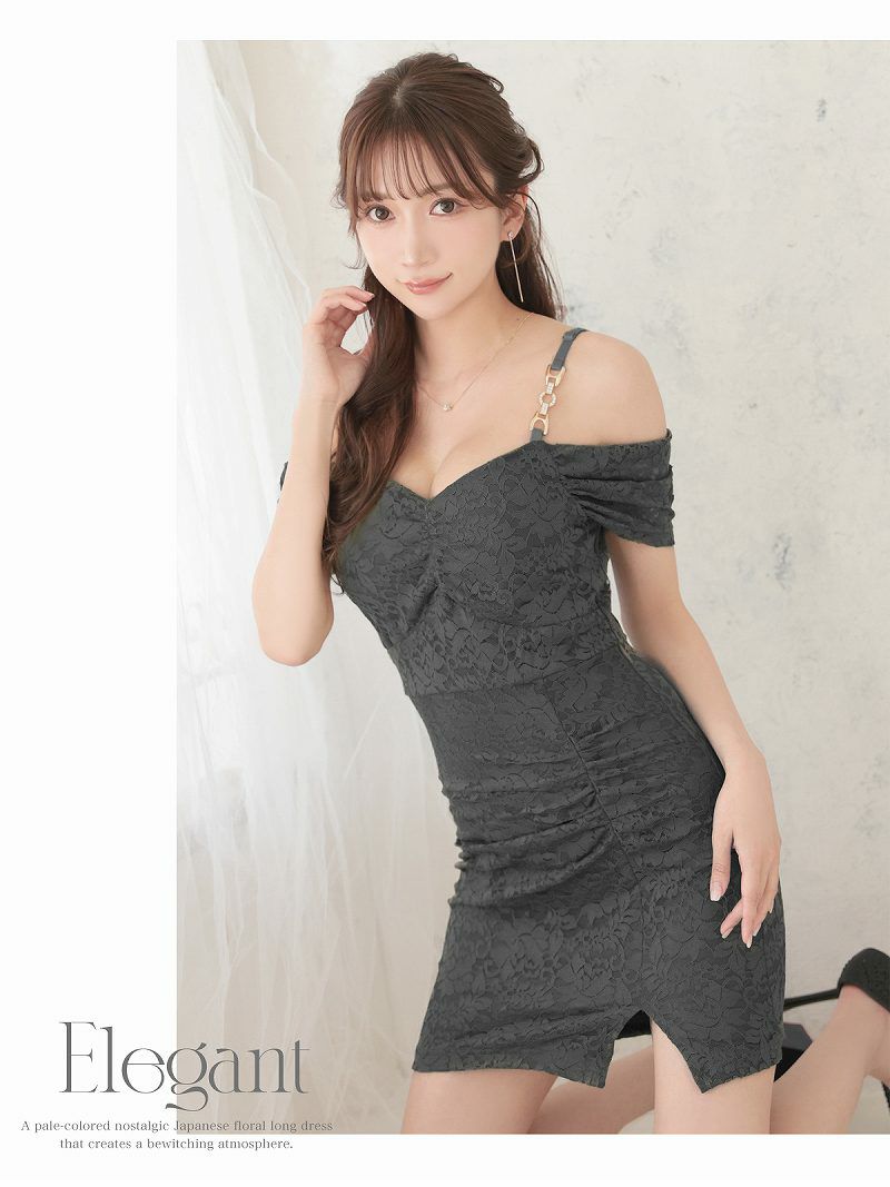谷間を綺麗に魅せるオフショル×ビジュー肩紐で色気も華やかさも◎なキャバドレスに仕上げました。