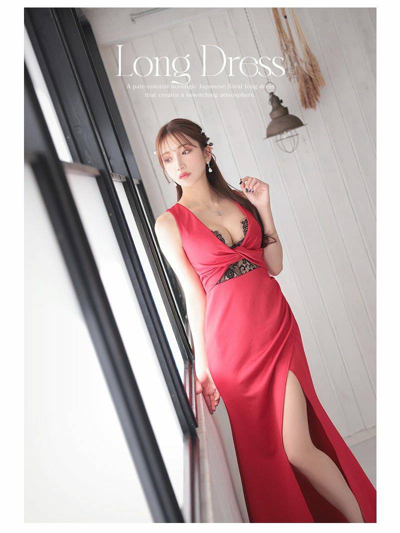 6. レッド×ブラックレース大胆谷間見せセクシーロングドレス【Ryuyu】(S/M/L)(レッド)