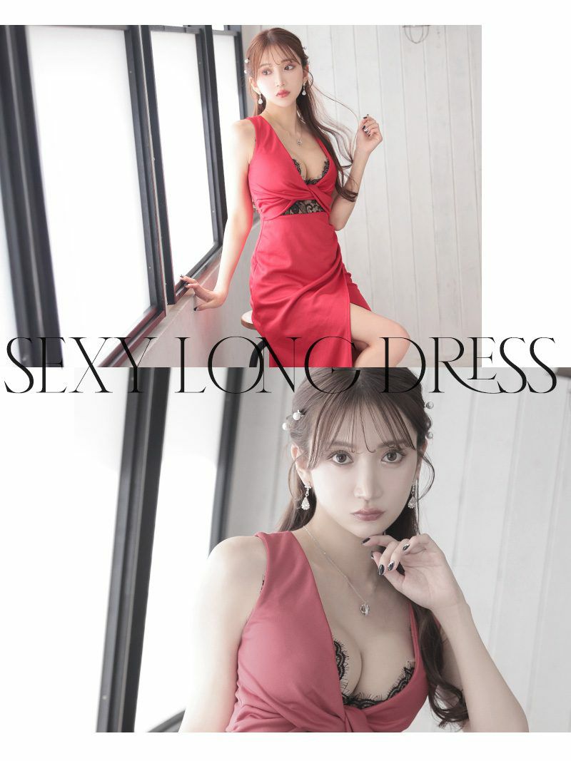 レッド×ブラックレース大胆谷間見せセクシーロングドレス【Ryuyu】