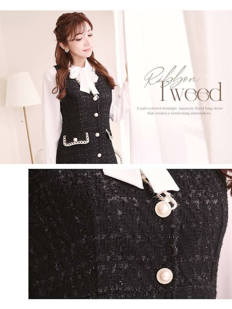 ツイードとボウタイリボンの組み合わせがお嬢様風で可愛いキャバワンピースです。