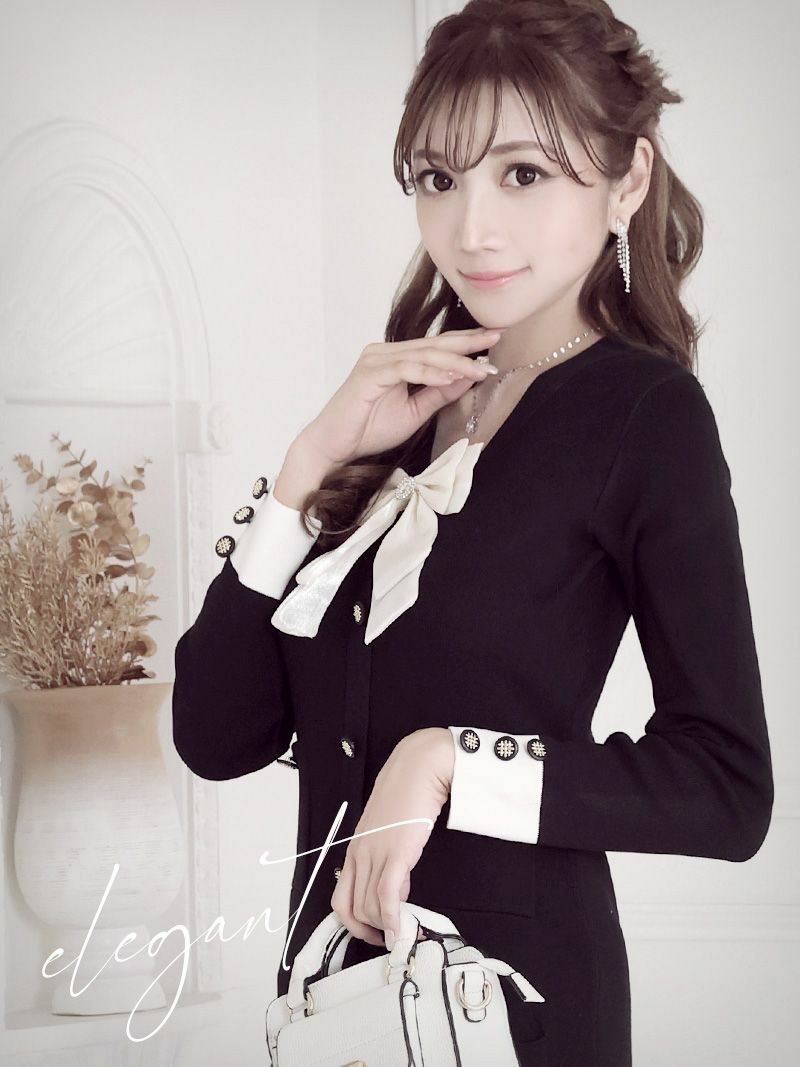 モノトーンリボン袖付きニットキャバワンピース【Ryuyu】