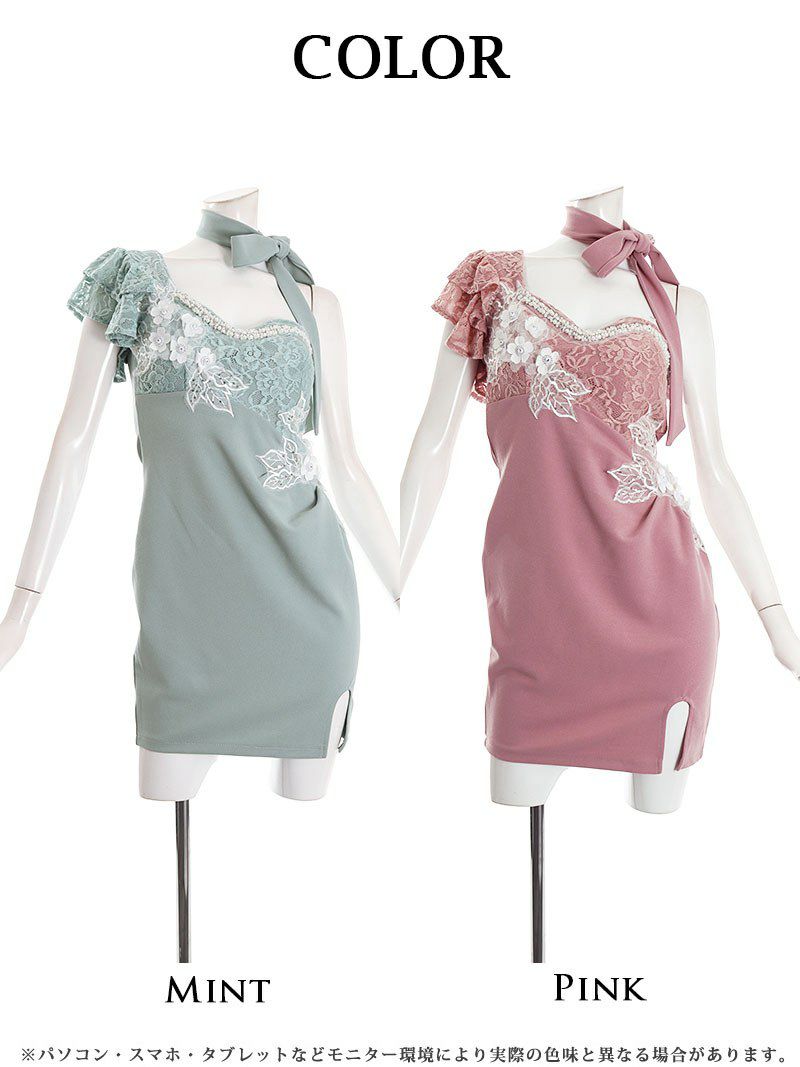 4. ワンショルダーデザイン立体花柄刺繍レースタイトキャバドレス【Ryuyu】(S/M/L)(ピンク/ミント)