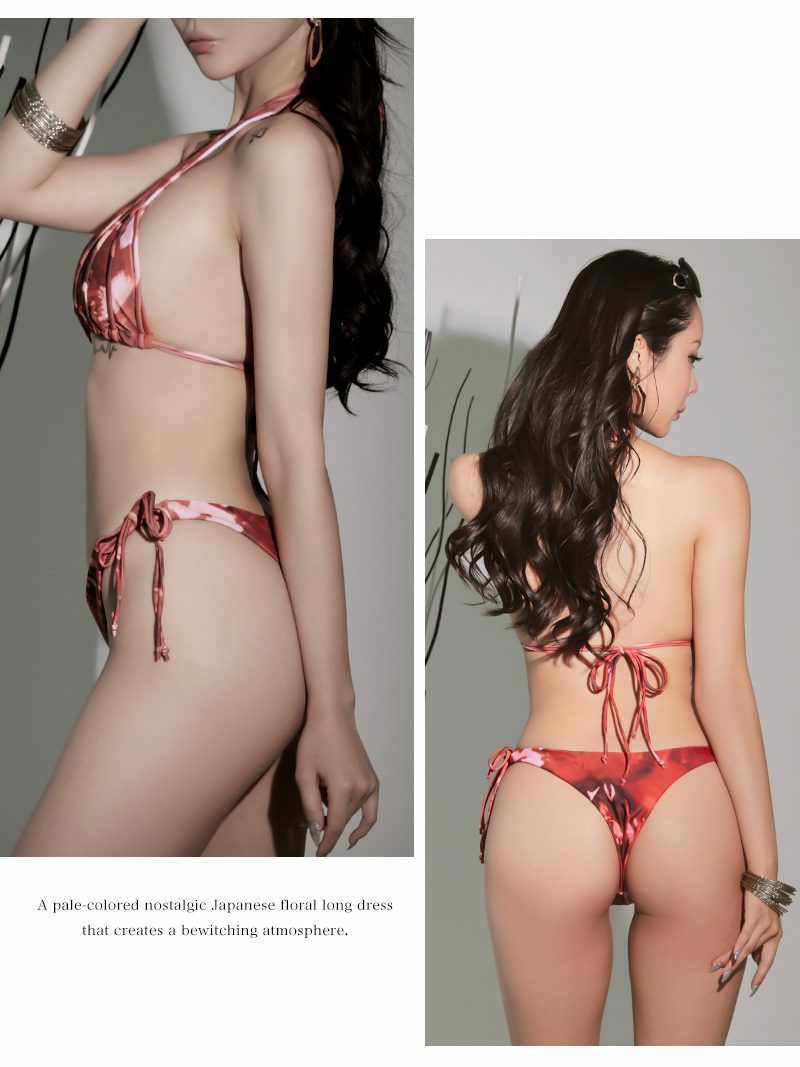 ビーチで注目度ナンバーワン! 美スタイル三角ビキニおしゃれプリント KANO 着用 キャバ水着セット【Ryuyu】(フリーサイズ)(ブラック/レッド)