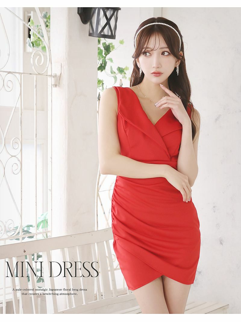 大きめ襟とスッキリVラインでで小顔効果を引き立て! 先行予約割¥1980→¥1881!※一部予約販売※Vネックカシュクールプチプラミニドレス【RyuyuChick】(M)(ブラック/ホワイト/レッド/ベージュ)