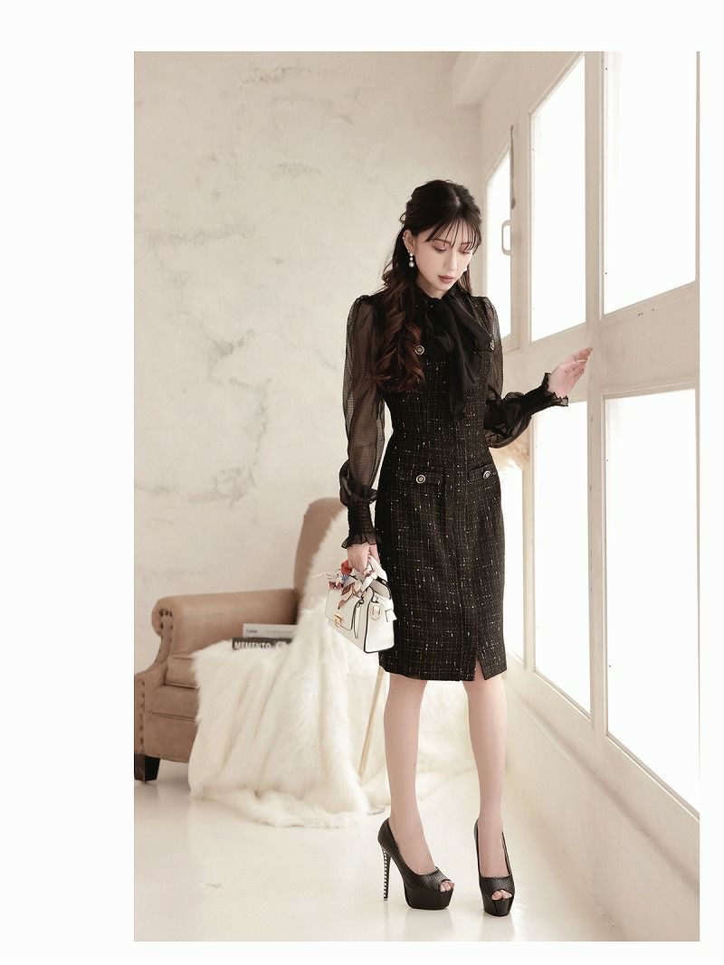 ボウタイリボンが目を惹くツイードシフォン袖付き膝丈タイトキャバワンピース 加賀美早紀 着用ワンピース【Belsia】