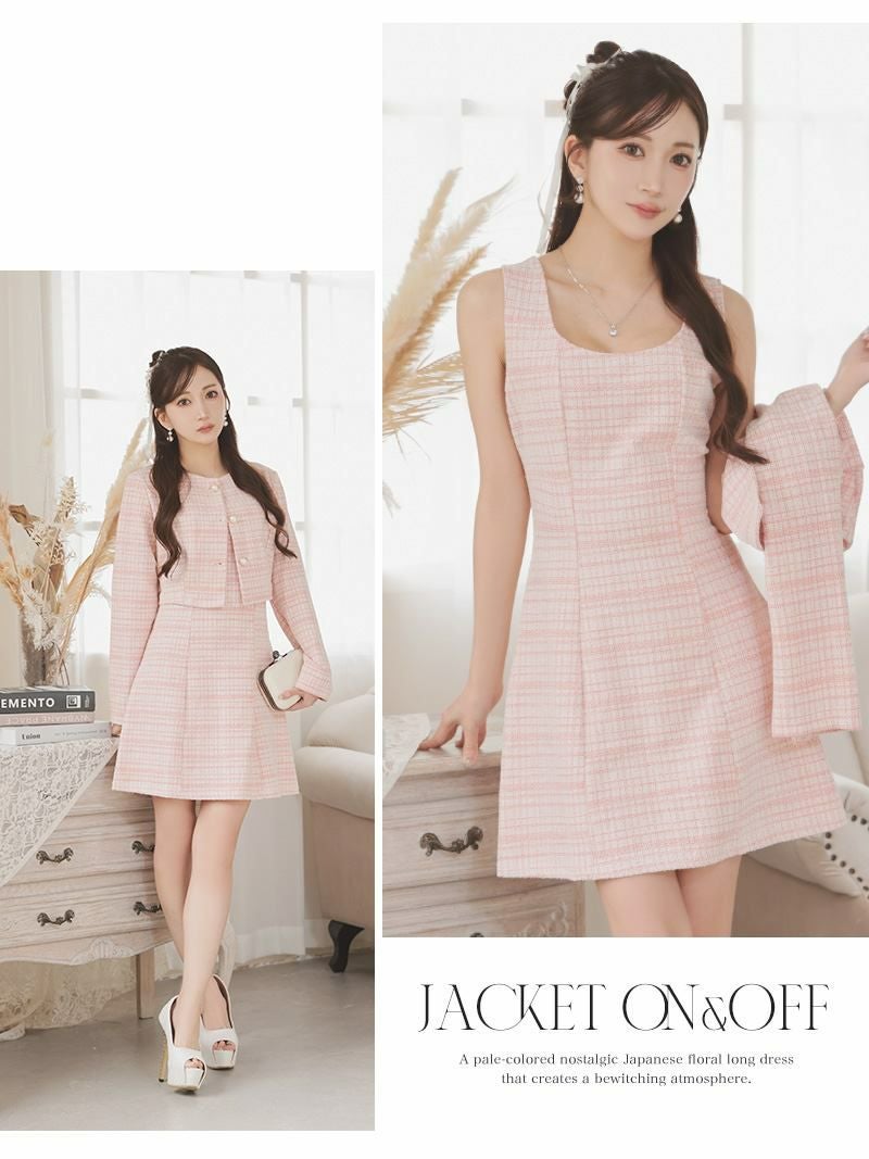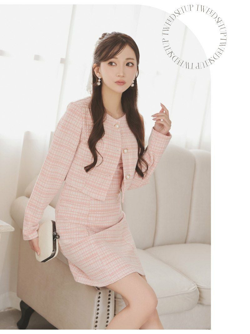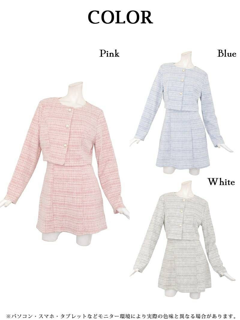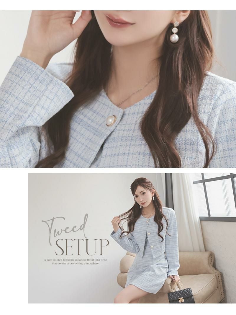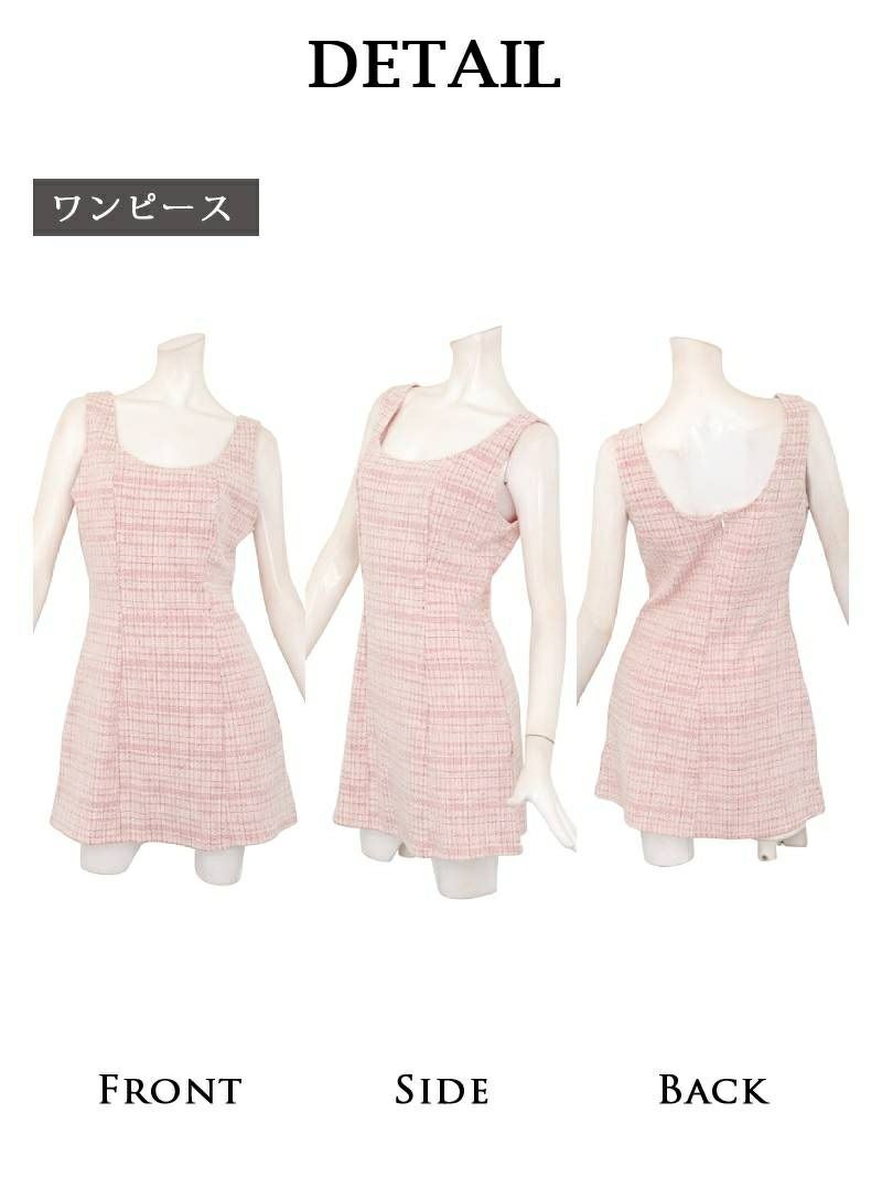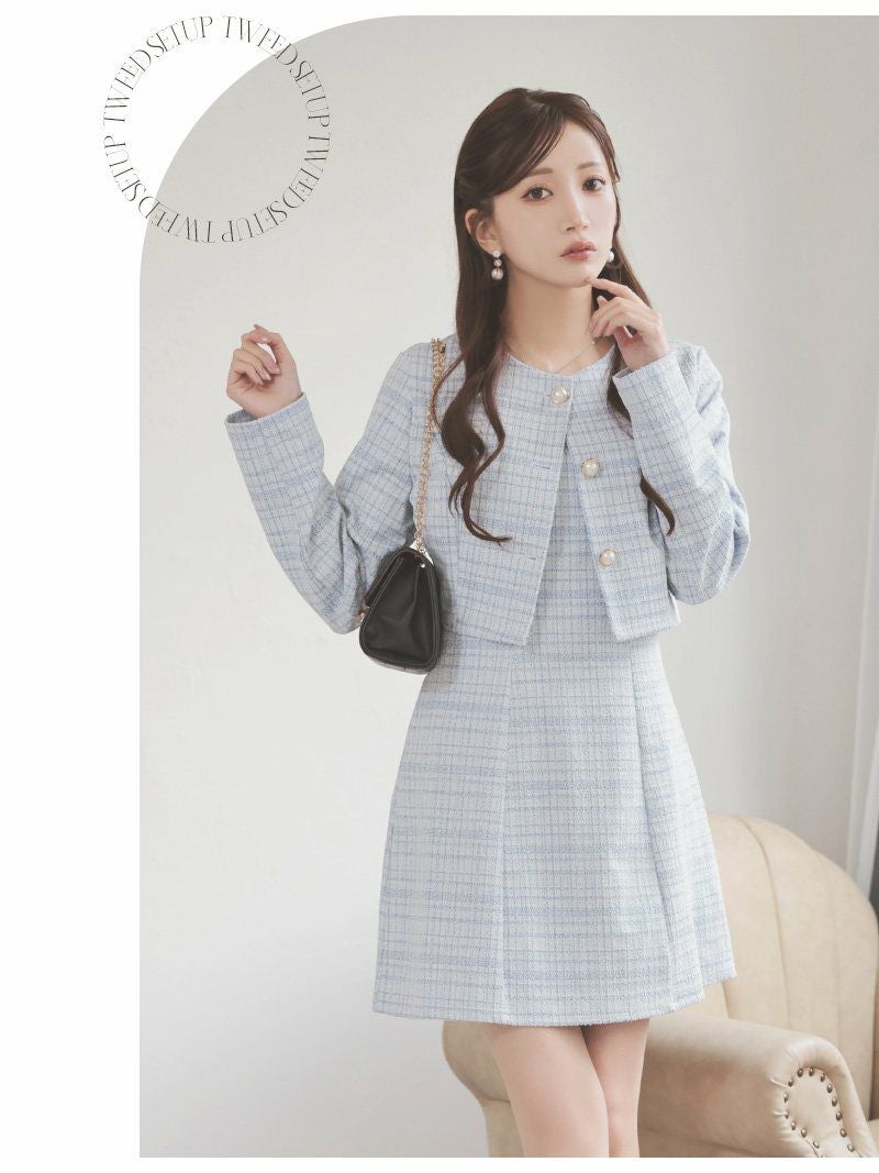 パールボタンとラメツイードで品格を纏う、清楚系チェック柄ワンピーススーツ。 先行予約割¥6980→¥6630!※一部予約販売※パールボタンが上品に輝くノーカラーのニットツイードチェック柄ワンピーススーツ 【Ryuyu】(XS/S/M/L)(ピンク/ブルー/ホワイト)