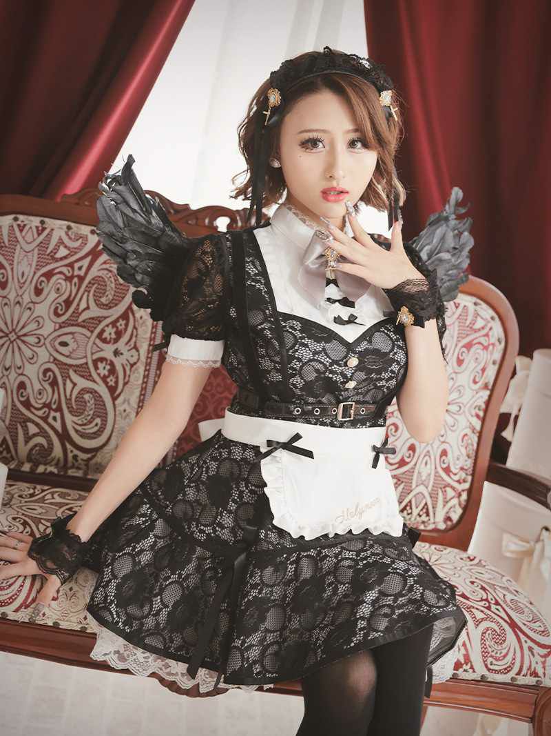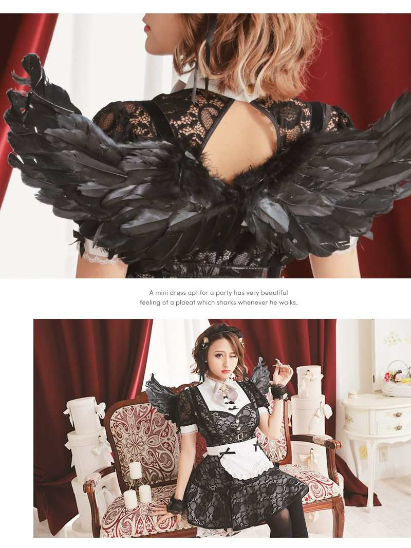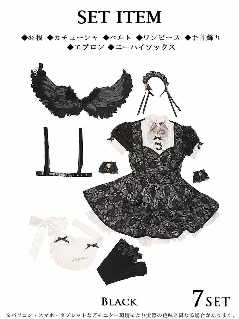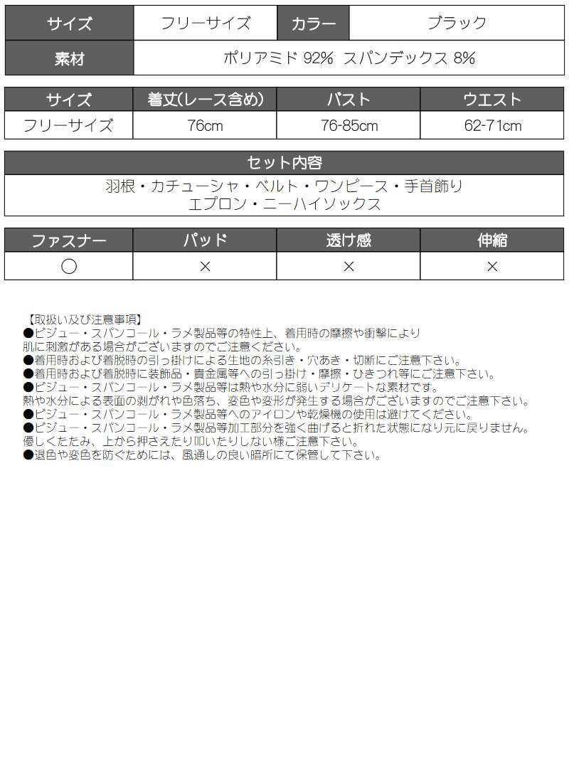 セット内容:カチューシャ・ワンピース・エプロン・羽根・ベルト・手首飾り・ニーハイソックス